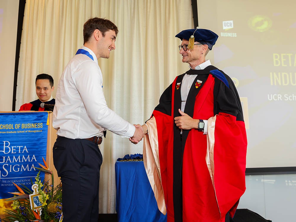 UCR School of Business Dean Yunzeng Wang addressed the inductees in his remarks: “Beta Gamma Sigma has been cultivating a community of the best in business for over a hundred years. Students who are inducted today will be joining a long line of leaders, including CEOs, Nobel Prize winners, and Olympians. We are excited to see our students add even more value to this organization as they live out their own success stories.