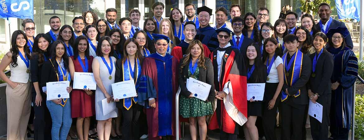 As the ceremony closed, those assembled, including new and past BGS members, faculty, and guests, were led by a UCR Pipe Band bagpiper from the ceremony into the patio reception area, where BGS members took photos with Dean Wang along with group photos and celebrated with refreshments.