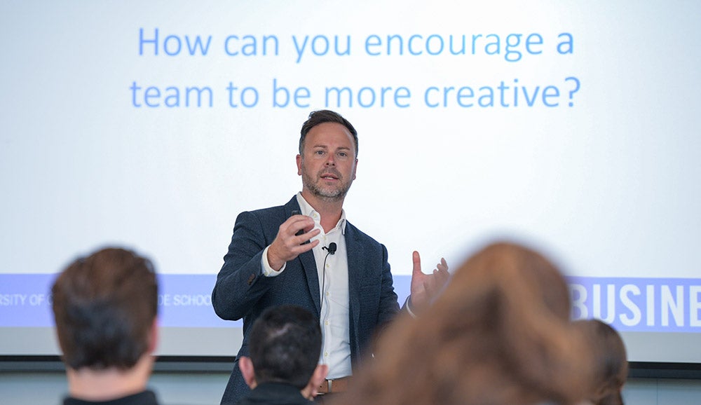 Prof. Kyle Ingram, professor of teaching in management, teaching an undergraduate business class in UCR's Student Success Center