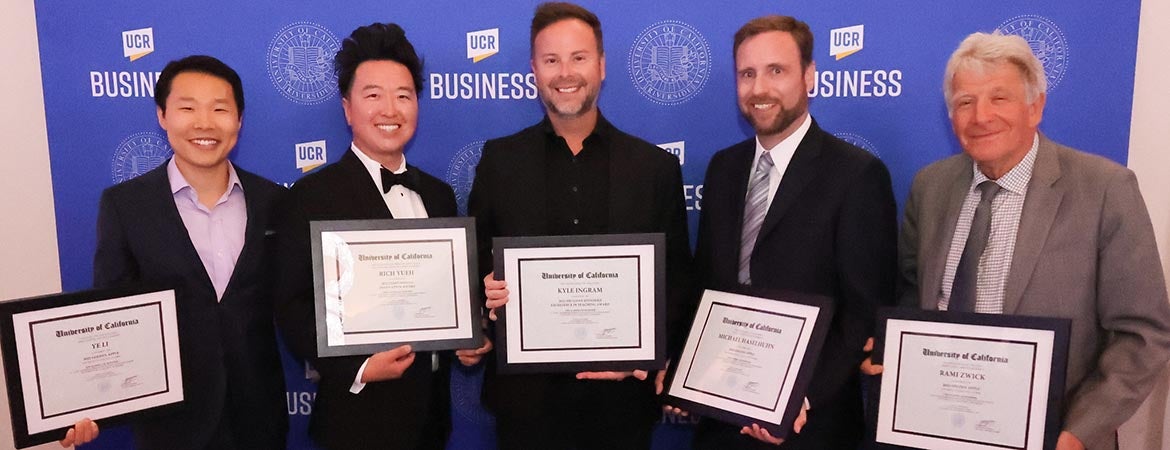 Header image (from left to right): UCR Business faculty awards recipients Ye Li, Rich Yueh, Kyle Ingram, Michael Haselhuhn, and Rami Zwick