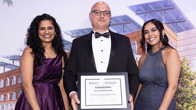 Management Lecturer Alexandru Roman received the Golden Apple for Excellence in Teaching Graduate Elective Courses. Roman’s students said that he teaches “effectively by giving real-world examples and encouraging participation in discussions,” “inspires UCR students to push boundaries,” and “forces us to look at known cases from a strategic point of view.”