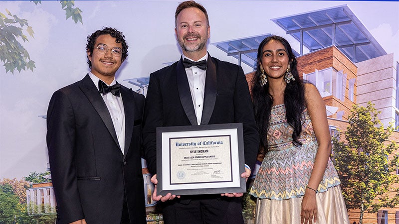 Undergraduate students Nico Palencia ’25 and Jaya Gazula ’24 with Golden Apple Awards 2024 recipient Asst. Prof. Kyle Ingram