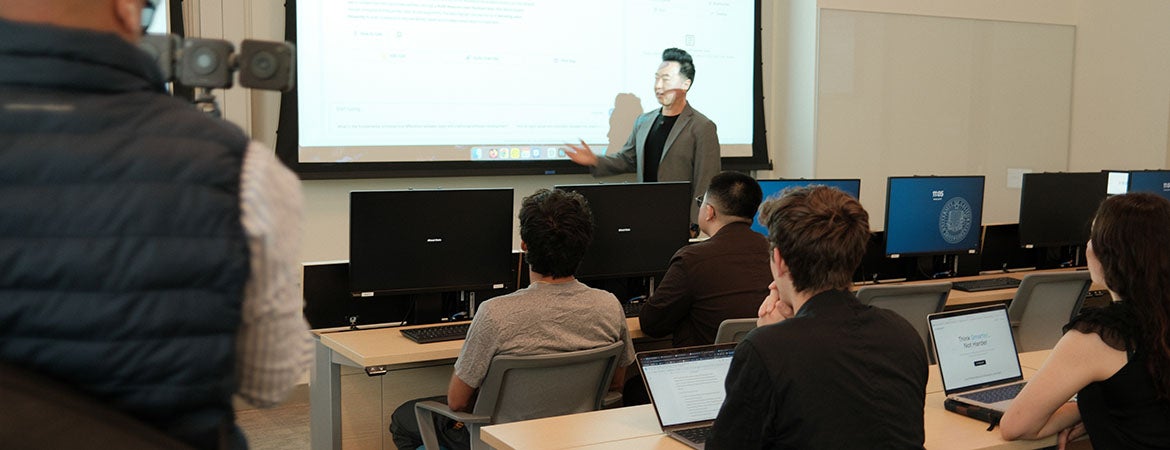 UC Riverside’s innovative spirit and strategic investments in technology took center stage this week as KTLA 5's tech reporter, Rich DeMuro, visited our campus to learn how our faculty and students are applying Google’s NotebookLM to academic work. DeMuro interviewed Rich Yueh, assistant professor of teaching in information systems, and several undergraduate Business students in the state-of-the-art computer lab located within the university's new School of Business building. The segment focused on their experiences using Google's NotebookLM to enhance academic work.