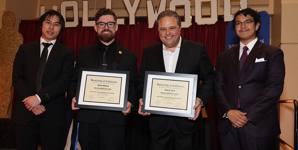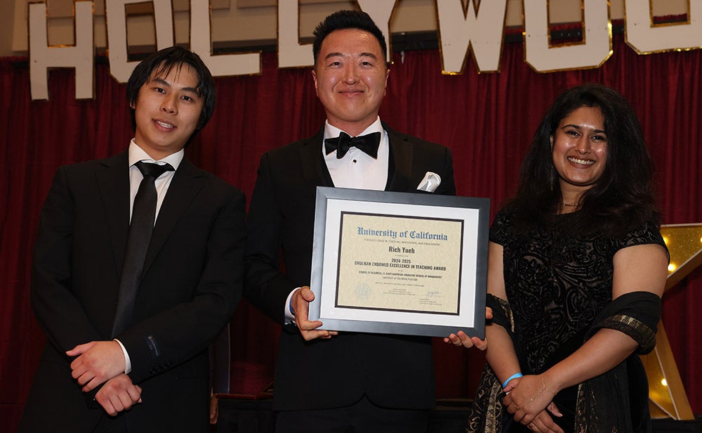 “The faculty of the School of Business are world-renowned scholars, teachers, and mentors. Each year, the school provides students an opportunity to give awards to the professors who have impacted their academic journey,” said Ishita Singhal ’25 MBA, president of the A. Gary Anderson Graduate School of Management Student Association, who was one of the evening’s student presenters.