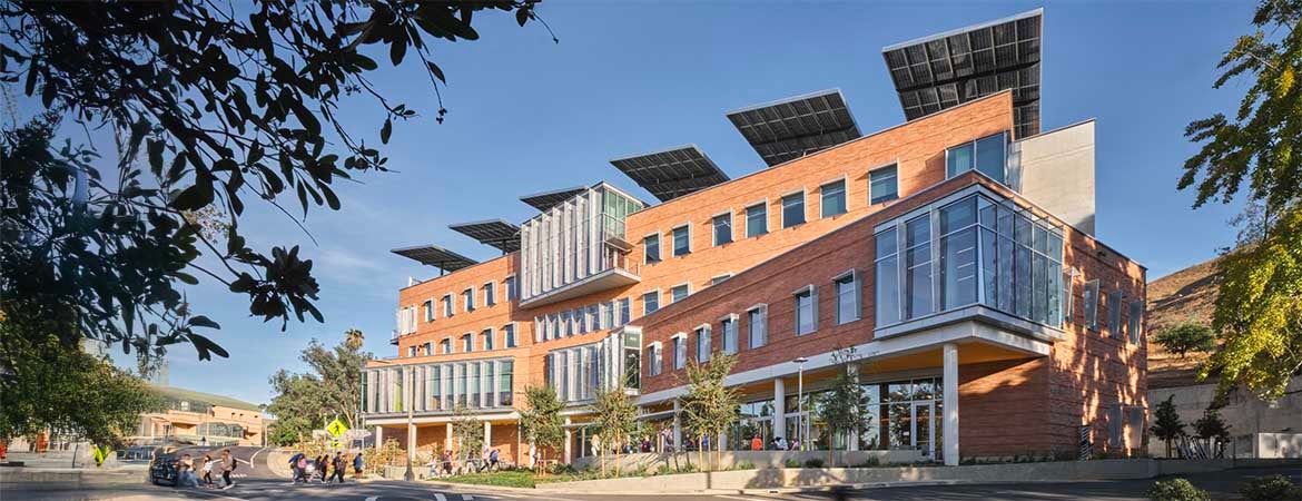 The building features locally sourced red brick known as UCR Brick, large glass windows, and metal sunshades and fins for shading and to reduce glare. An outdoor plaza is shaded by parts of the second floor that extend out front. In the back, the project blends into the hillside so that the second floor leads out to an open courtyard that can be used as a mini-amphitheater.