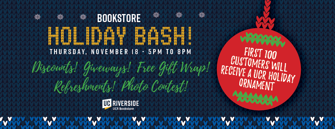 Head down to the UCR Bookstore for their Holiday Bash on Thursday, November 18th from 5pm-8pm. Enjoy discounts, giveaways, free gift wrap, and refreshments!