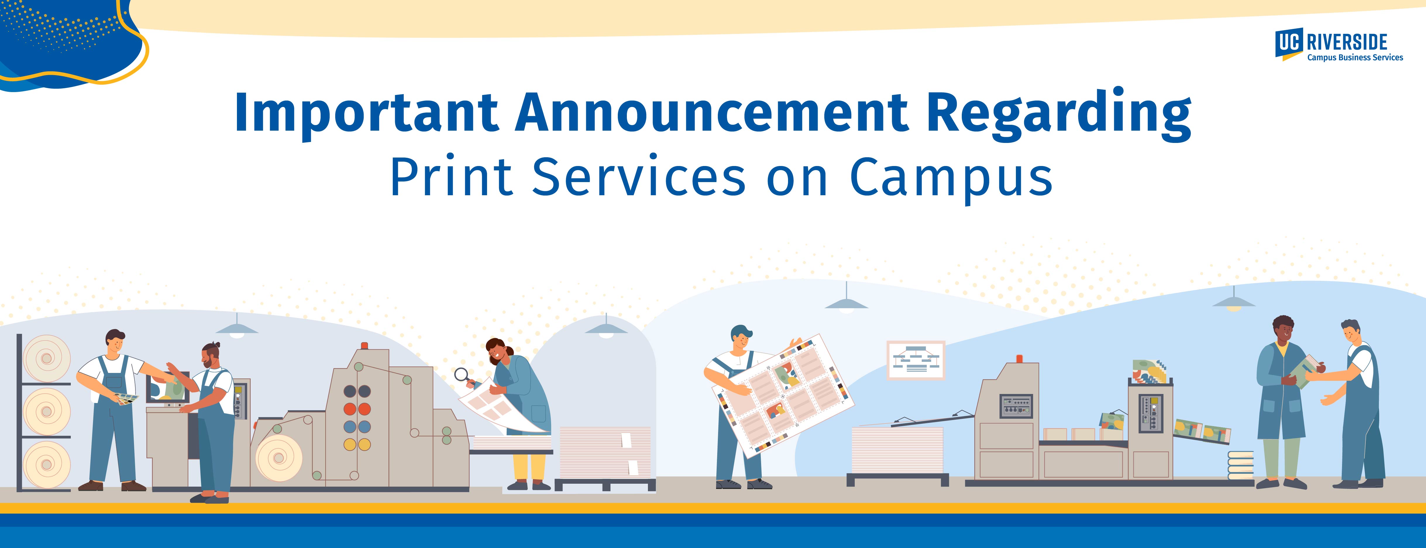 After exhaustive analysis and review by leadership, Digital Print Services ceased large scale, commercial print production in fiscal year 2020-2021. While the pandemic slowed down this transition, Campus Business Services needs to maintain the delicate balance between providing value-added services and financial stability. Digital Print Services will continue to serve the UCR community with limited and affordable print services including, but not limited to: