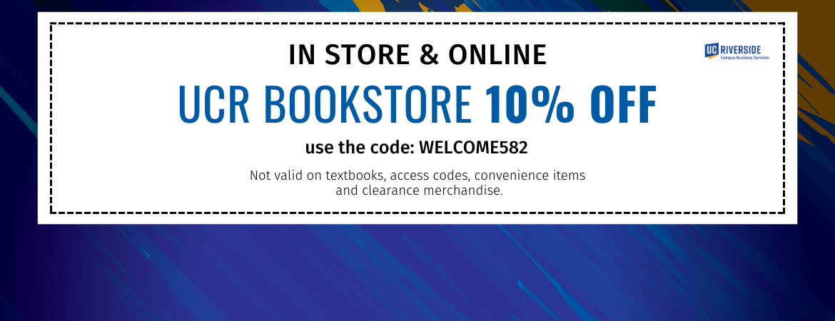 Need some UCR spirit wear, Highlander swag, or gifts for family? Check out all the new items at the UCR bookstore, either ONLINE or in store, and save 10% on your entire purchase by using the code: Welcome582 during checkout. The discount is not valid on textbooks, access codes, convenience items, or clearance merchandise.