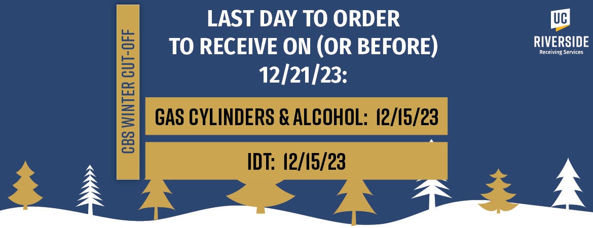 UC Riverside Receiving Services has announced the order by dates to receive Gas Cylinders and Alcohol, and IDT on or before December 21st.