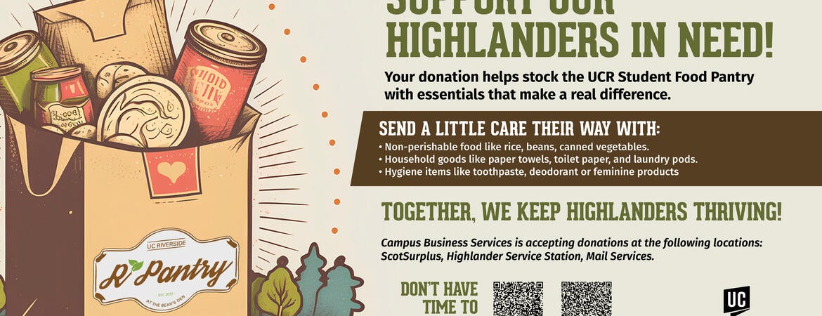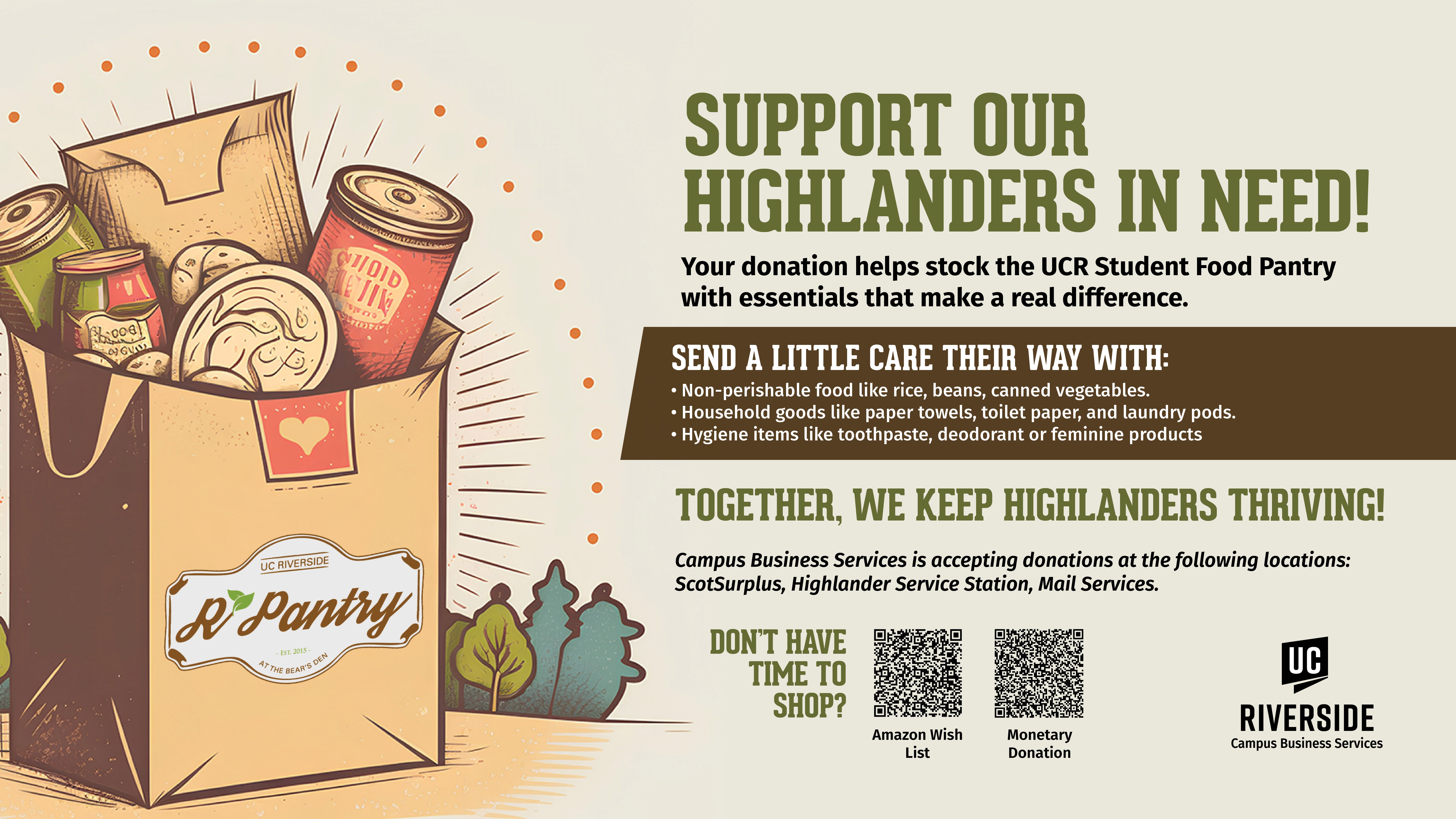If you don't have time to shop, feel free to visit our Amazon wishlist and ship to 3401 Watkins Drive, Riverside CA, 92521 or donate money at the UCR Giving page here: https://myadv.ucr.edu/ and search for 200944 for the "Student Basic Needs Support Fund."