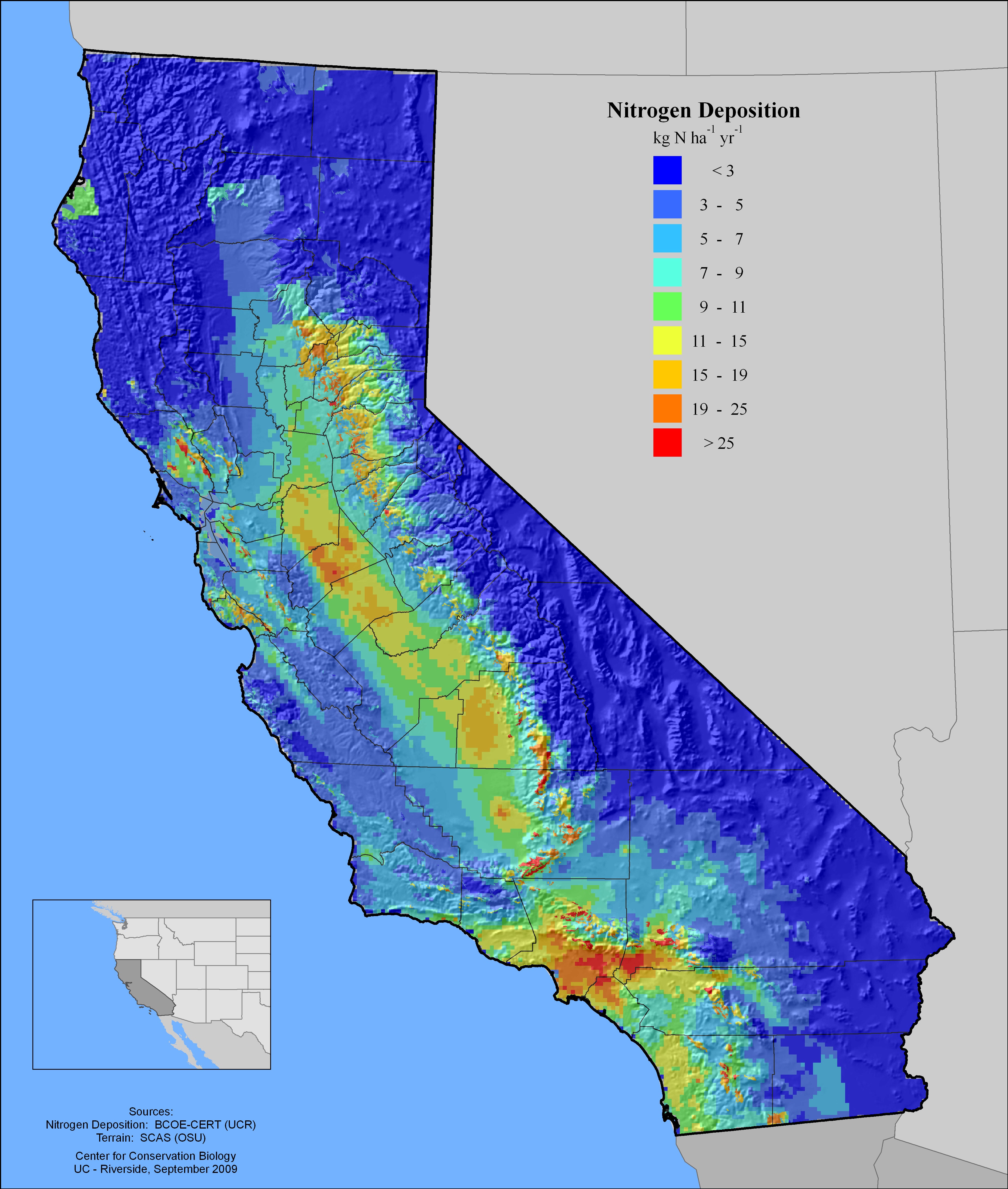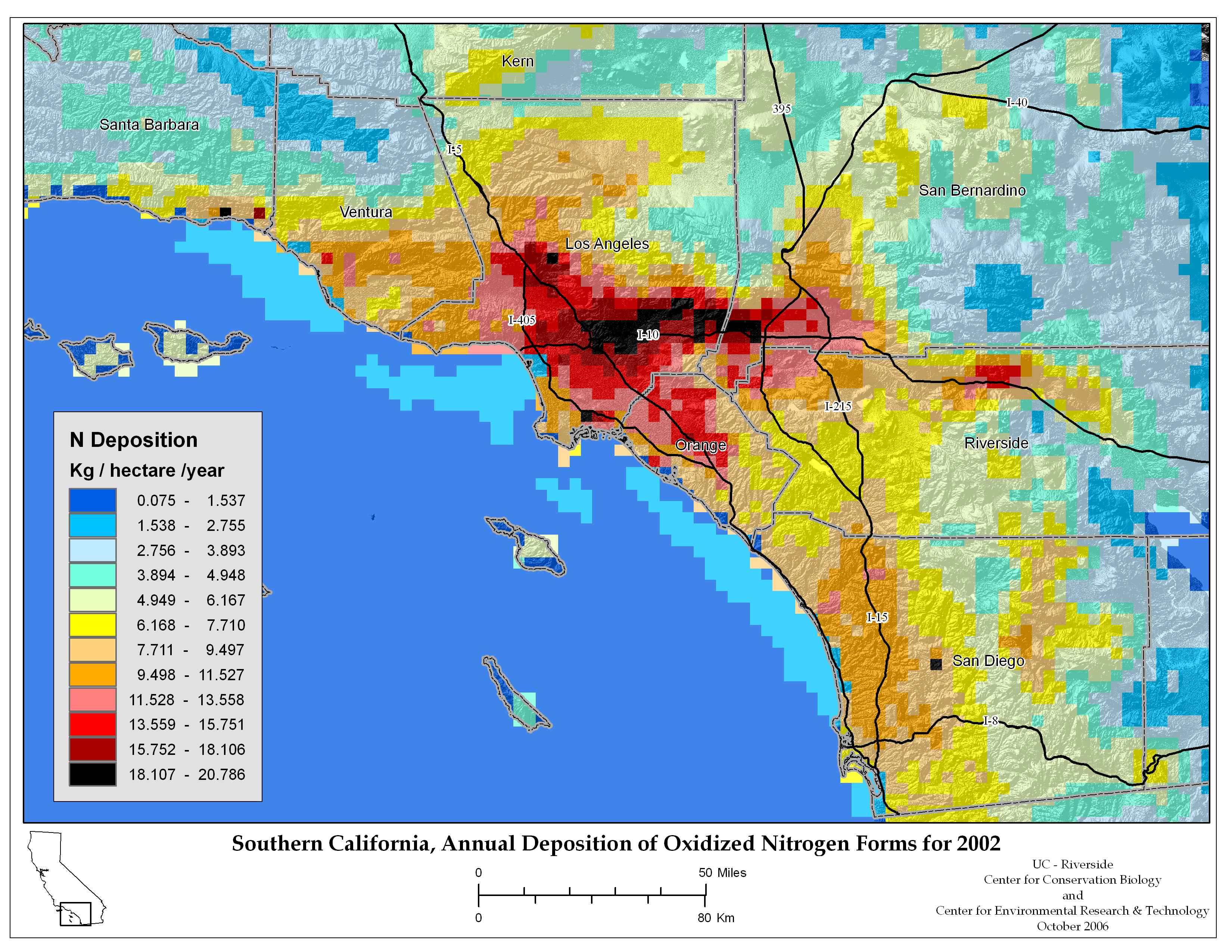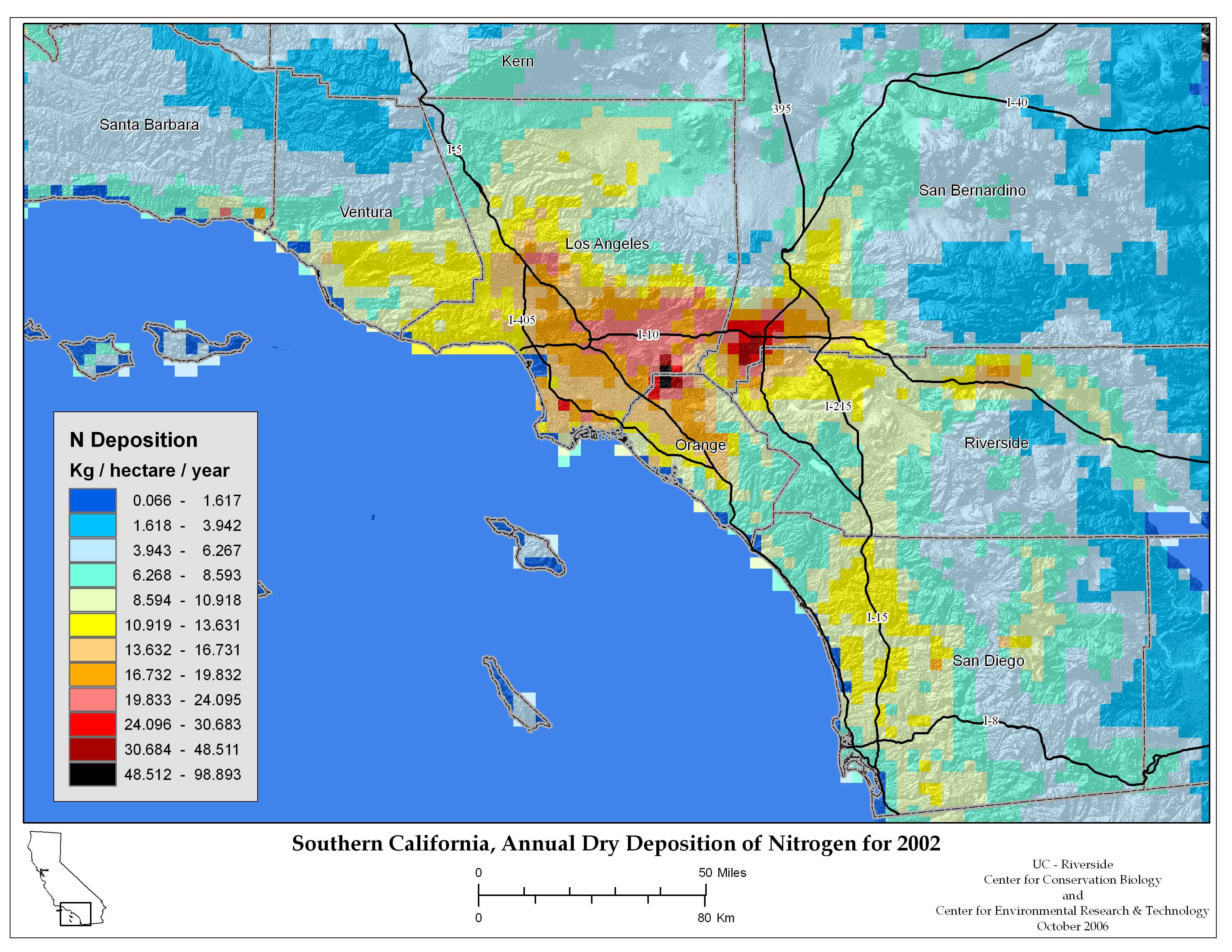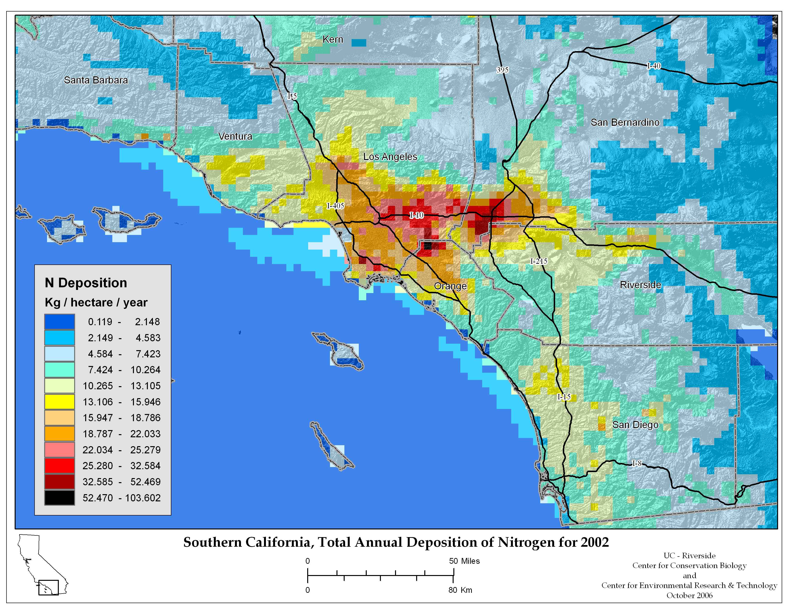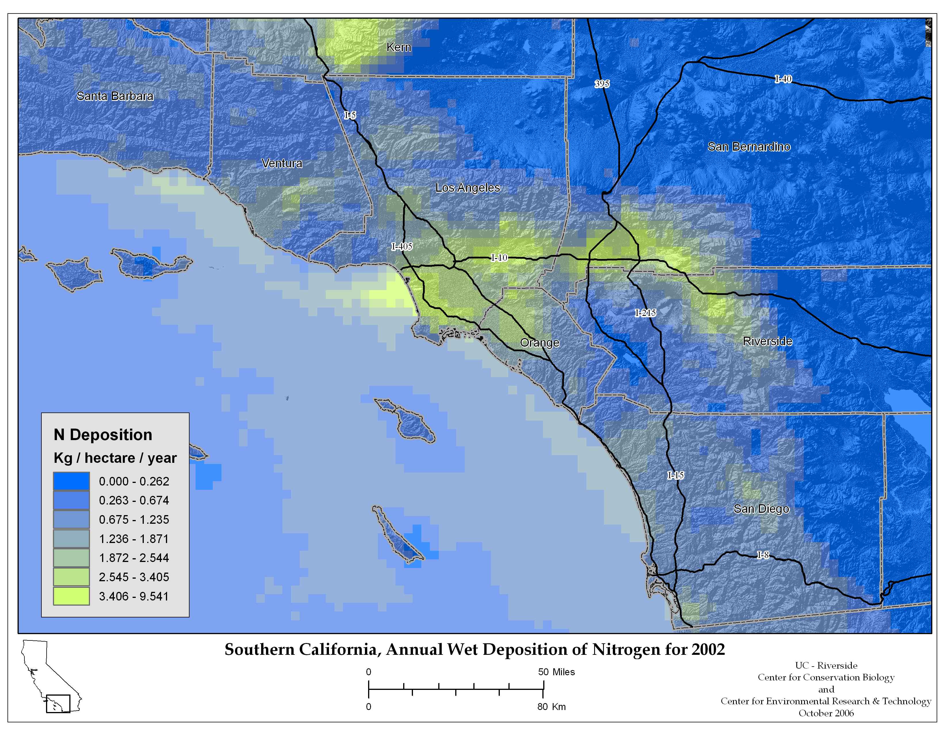 | Annual Wet Deposition Nitrogen deposition map for Southern California in 2002. | |