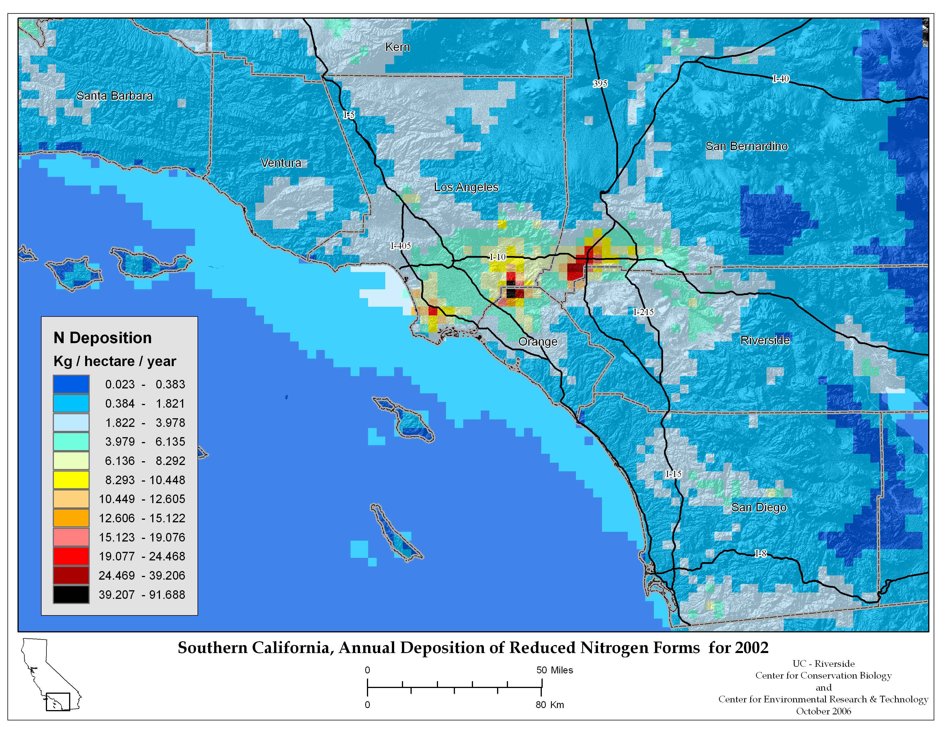 | Annual Deposition of Reduced Forms Nitrogen deposition map for Southern California in 2002 | |