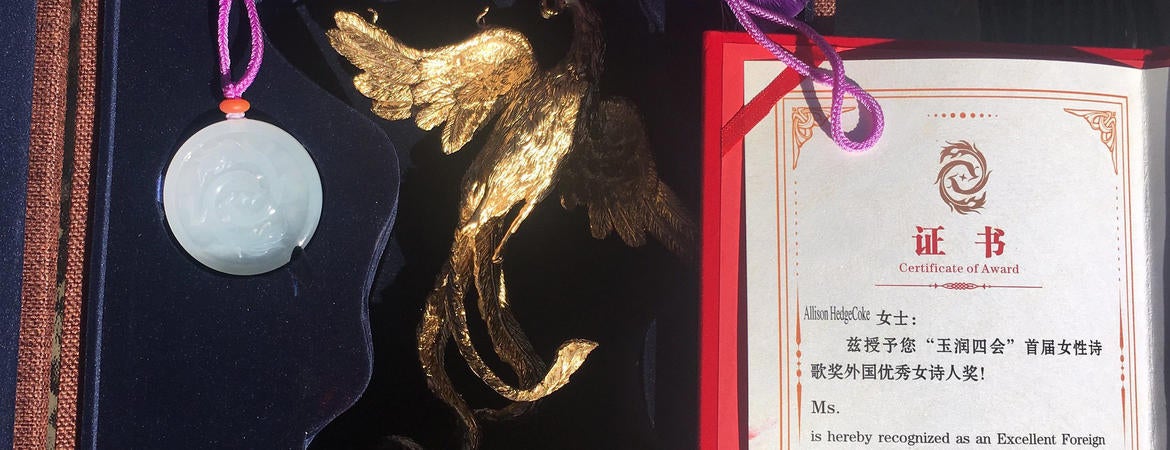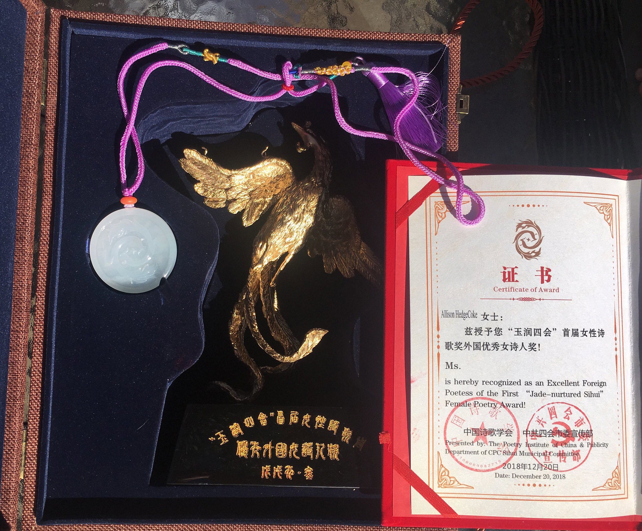 After touring the local attractions, Hedge Coke attended a formal ceremony alongside poets from numerous other countries, including Russia, Turkey, Japan, Columbia, France, Korea and Vietnam. This final evening held an award ceremony, where she received credentials from the country, monetary compensation, a trophy and an engraved Jade medallion. Every major Chinese media entity covered the event. One asked Hedge Coke to create a poem for the occasion.