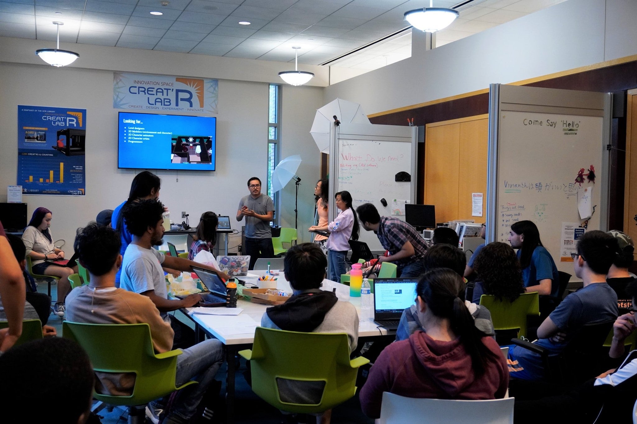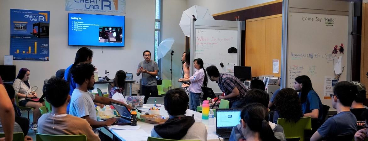 Gamespawn, a video game development organization, meeting in UCR's Creator Lab.