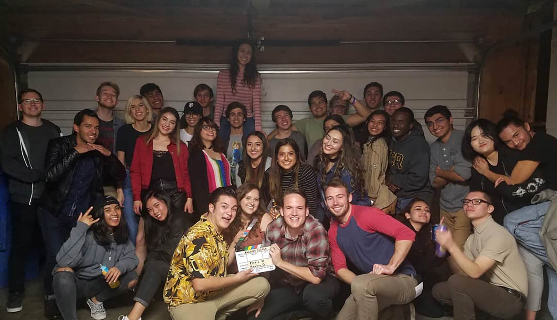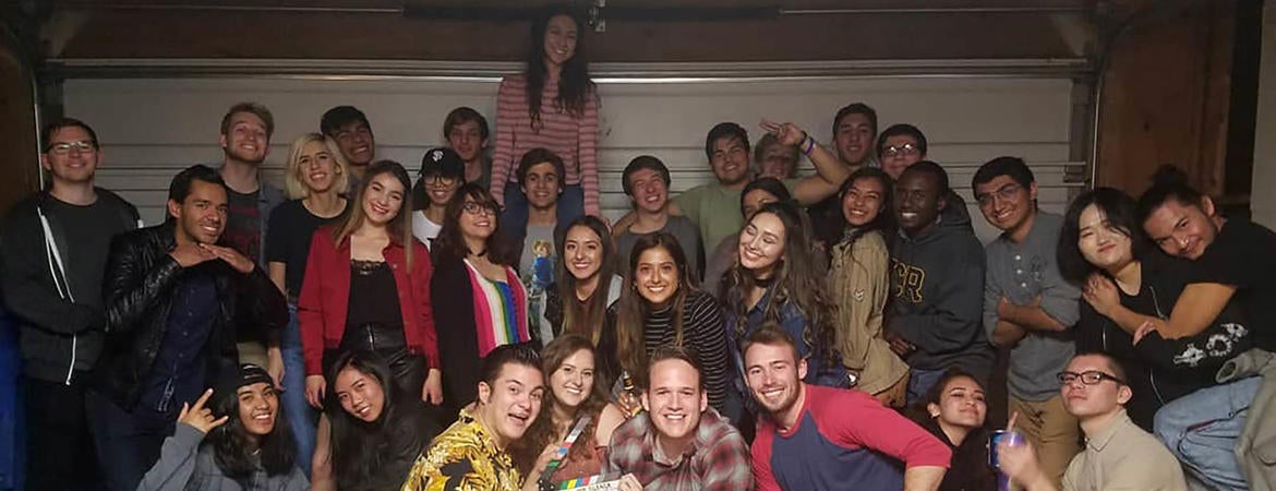 The R'Shorts team and cast of the student-led film Awkward Silence pose for a photo after wrapping up filming for the day.