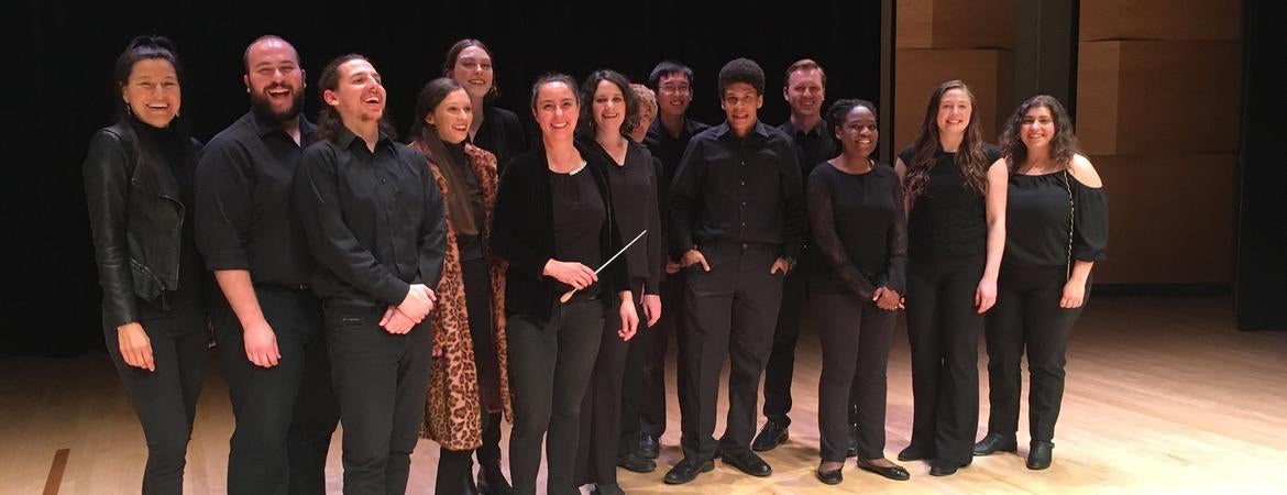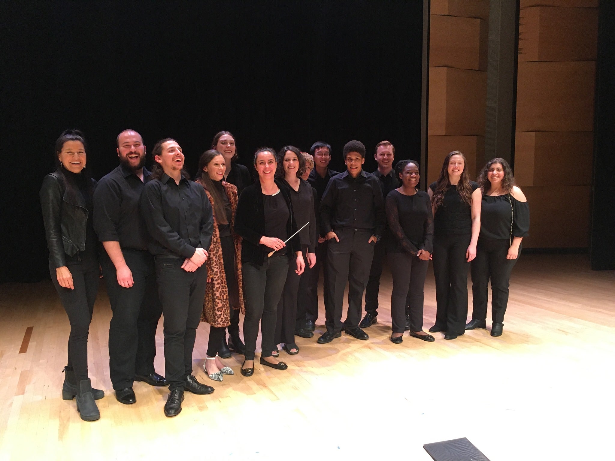 FEATURED PHOTO. Visiting Assistant Music Professor Dana Kaufman, (first row, fifth from right), poses with composers, performers, conductors and fellow professor Kimberly Guerrero (far left), at a micro opera performance in December."