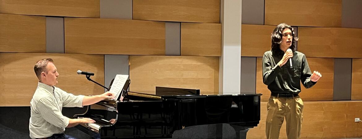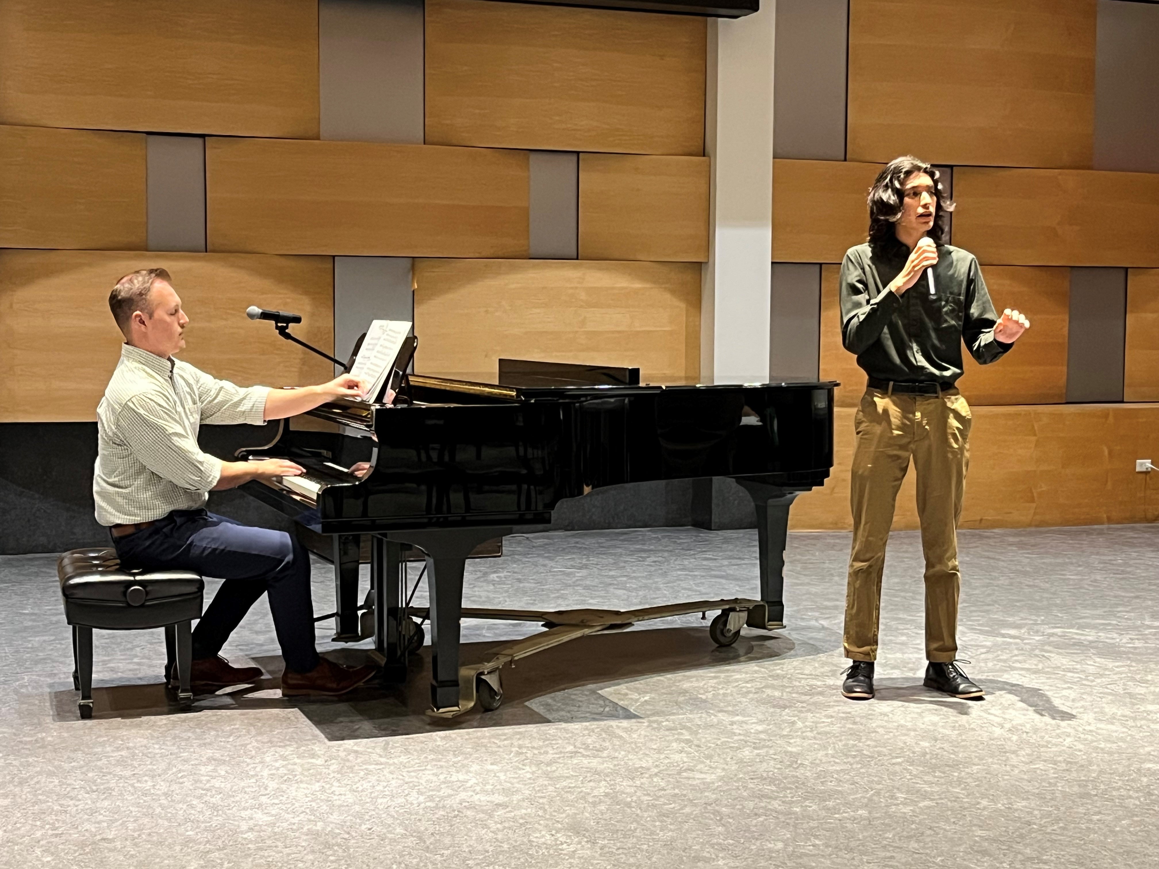 FEATURED PHOTO. Emyr Ortiz, tenor, and Jonathan Keplinger, piano, running through the song "How It Ends" from the musical Big Fish, during the sound check for the student performance recital in the Bayz series on November 29, 2023. Photo by Deborah Wong