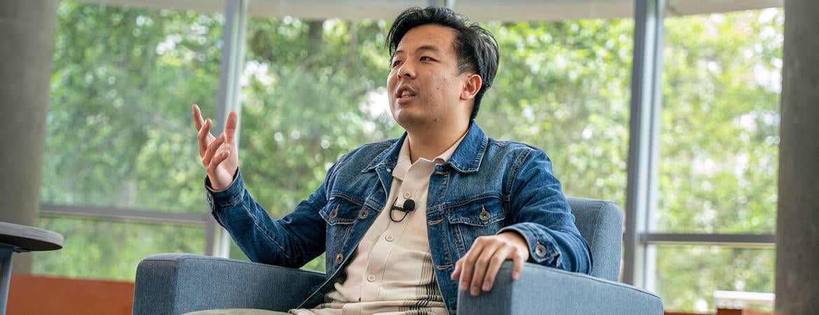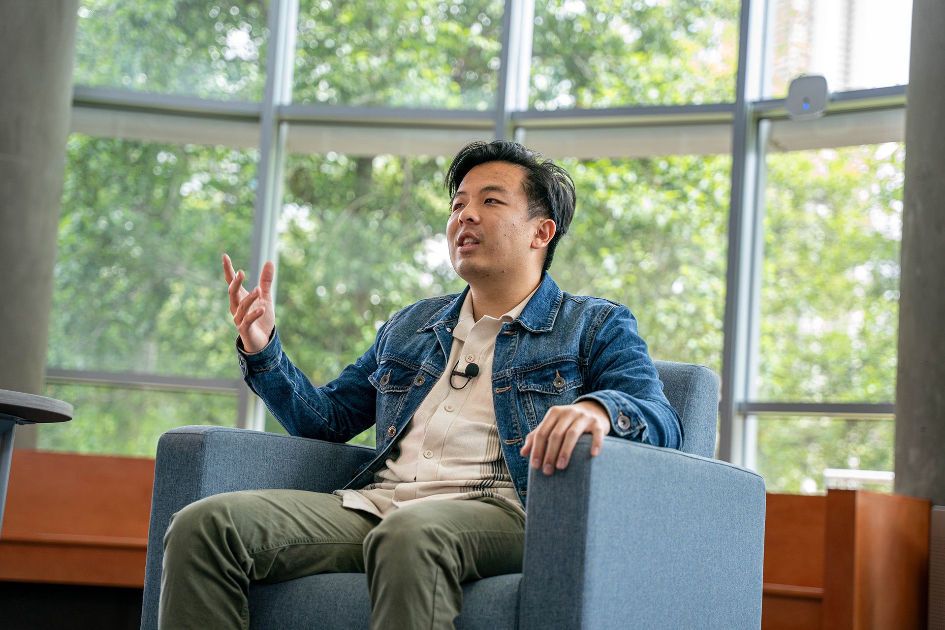 FEATURED PHOTO. Aronne Chan gestures as he answers questions from an interview held in the HUB above the Commuter Lounge.