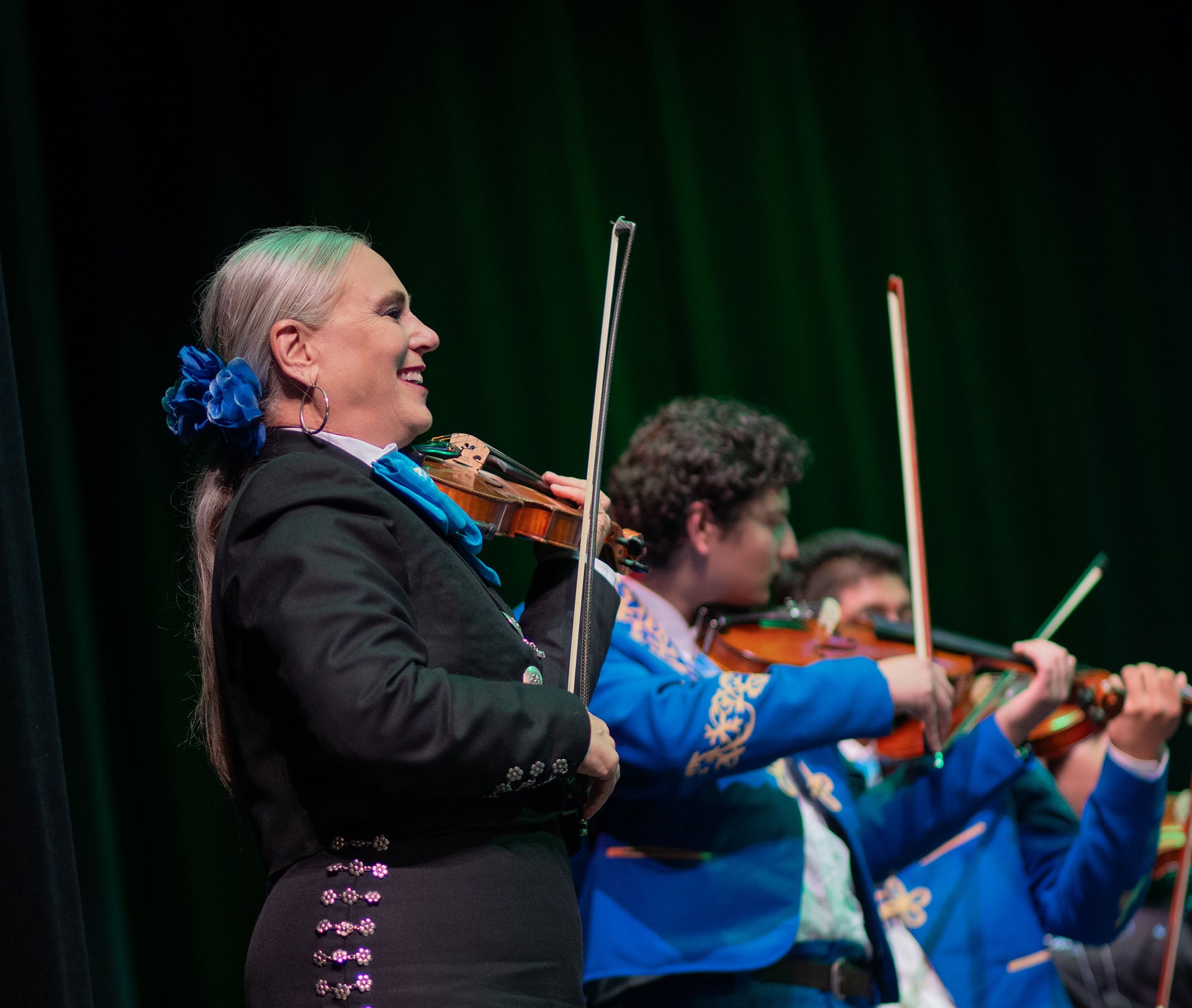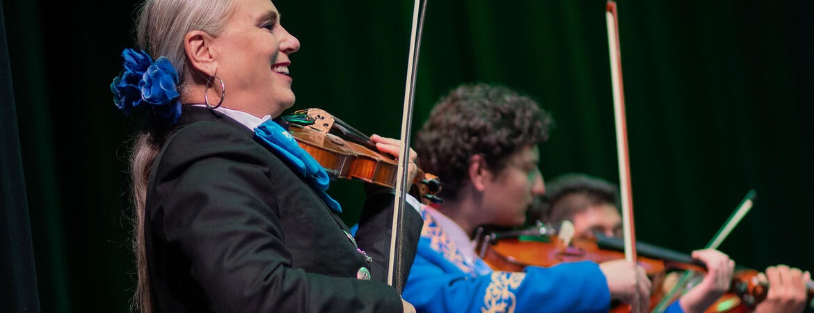 FEATURED PHOTO. Director Cynthia Reifler Flores of Mariachi Los Alteños de UCR plays the violin as she leads the ensemble.