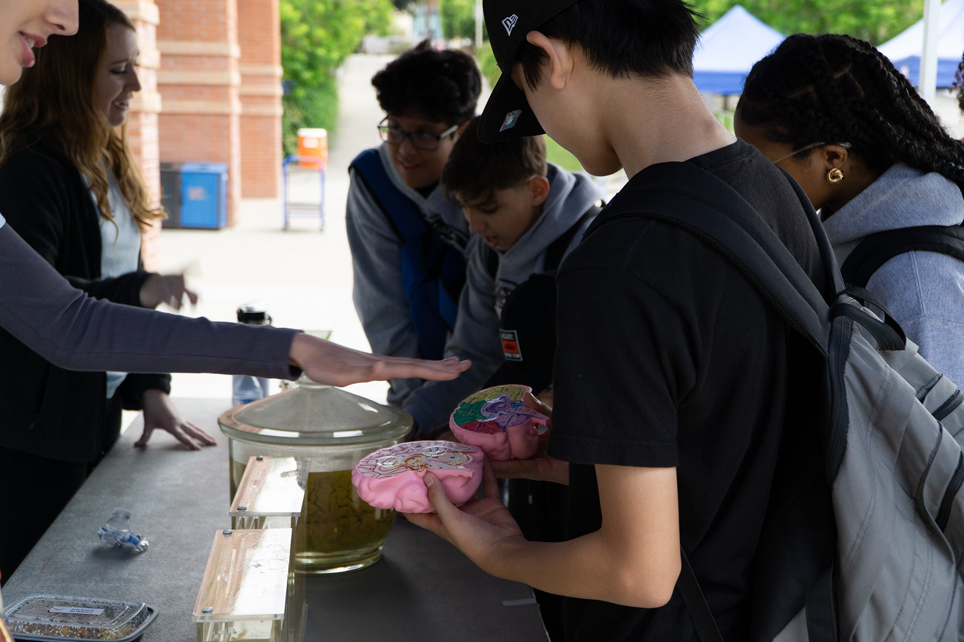 FEATURED PHOTO. A booth engages with visiting students by displaying models of the human brain, among others.