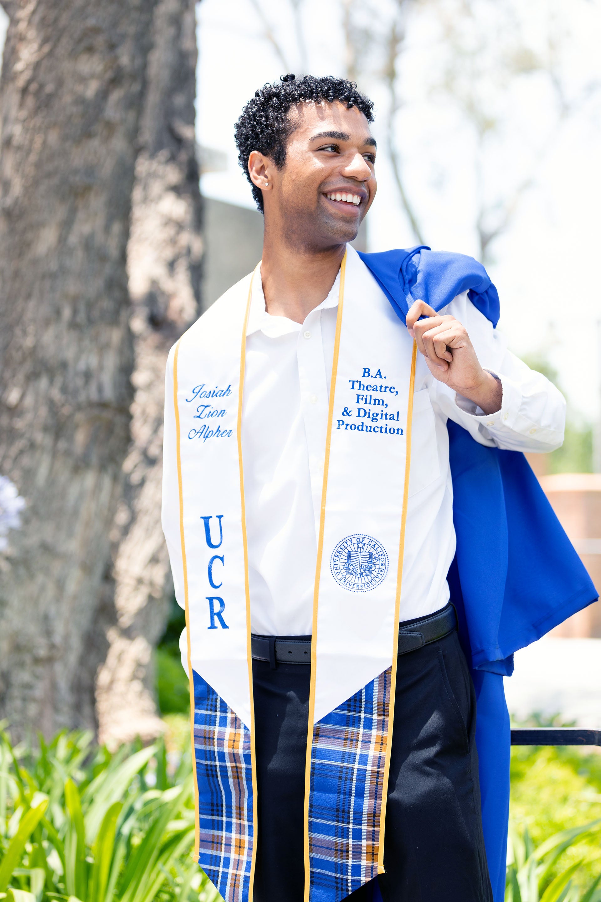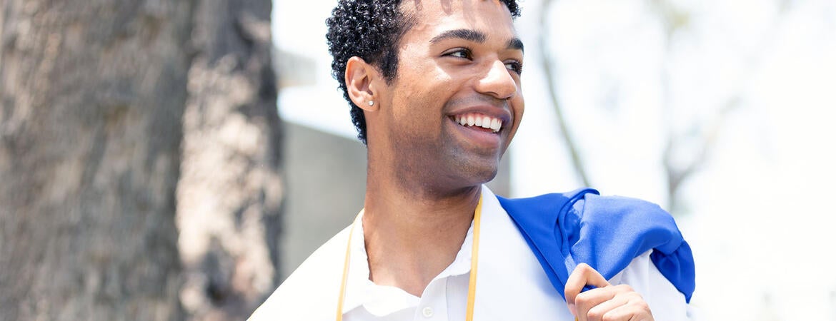 FEATURED PHOTO. Josiah Alpher stands in a sunlit courtyard, graduation gown slung over his shoulder.