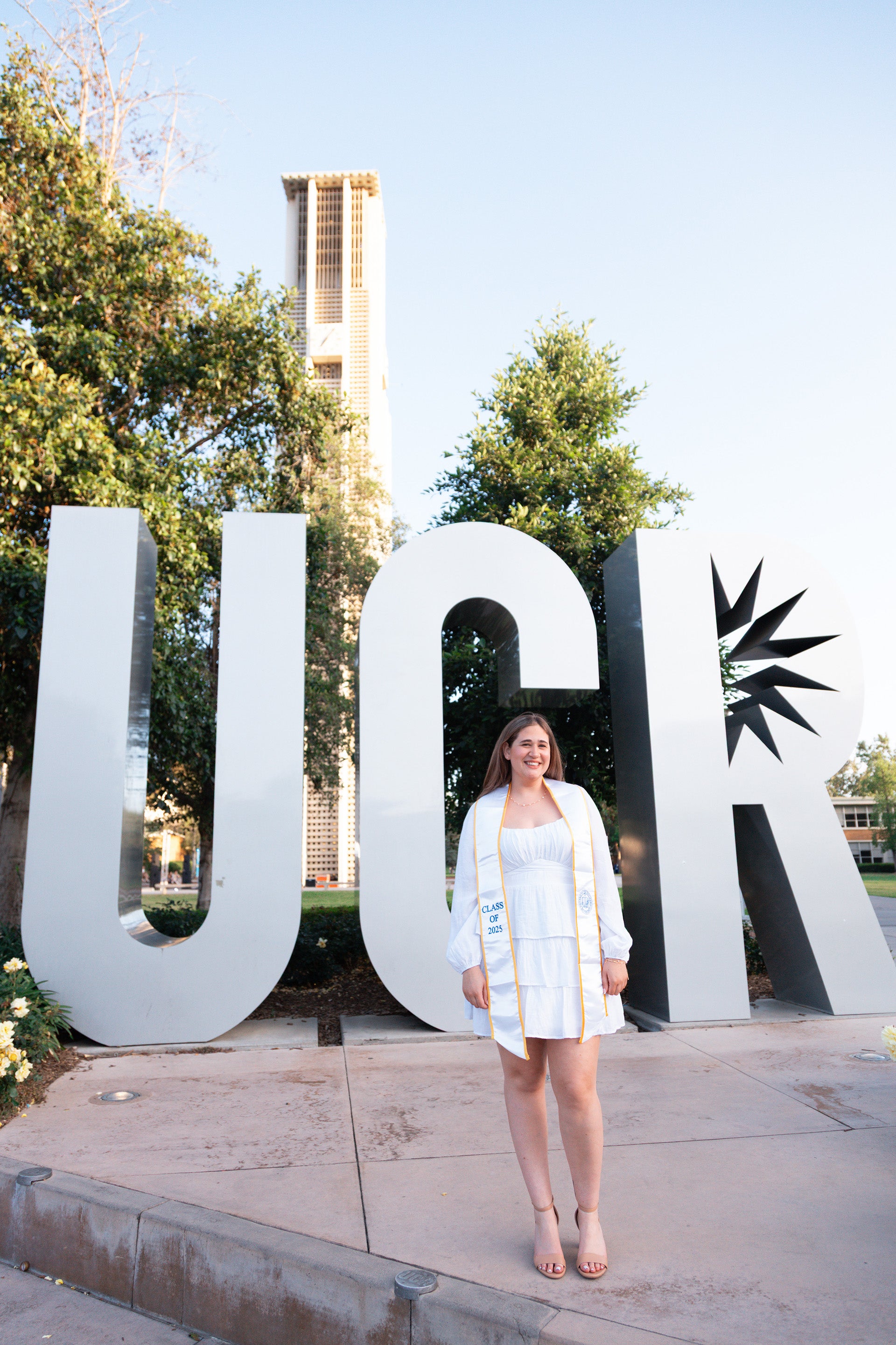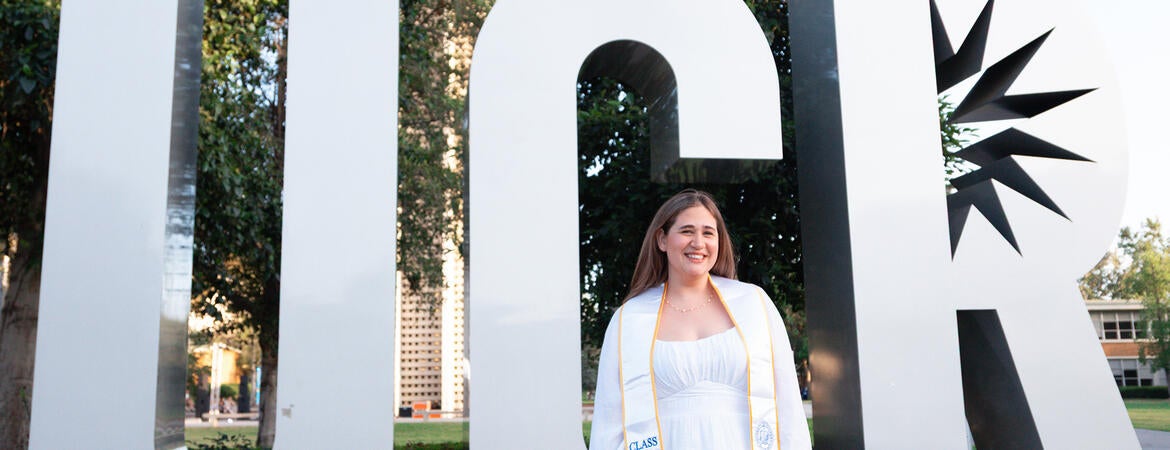 FEATURED PHOTO. Gracie Bernstein stands before the UCR sign, the bell tower standing behind her.