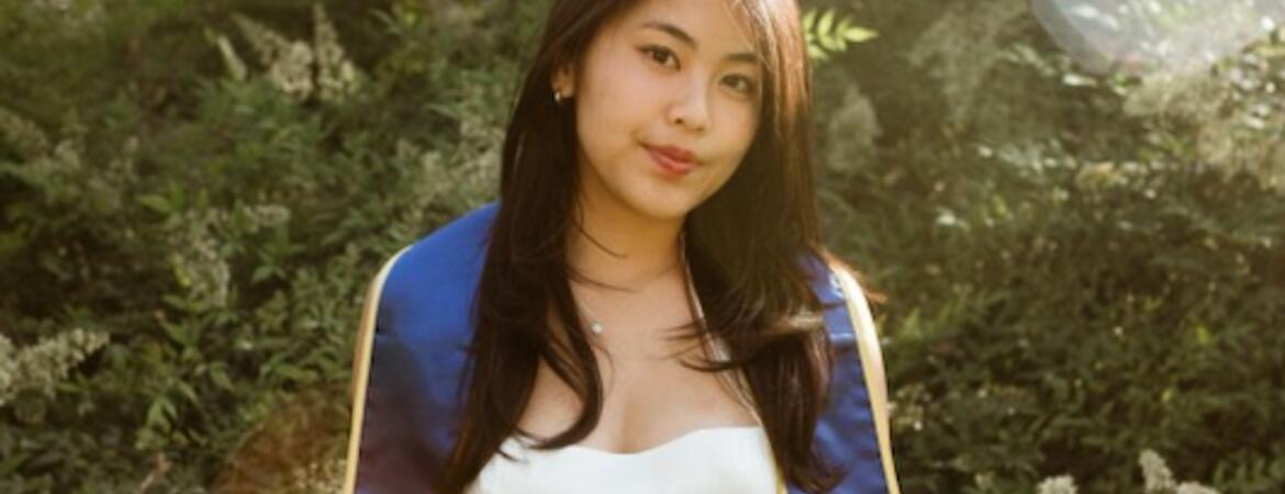 FEATURED PHOTO. Michelle Nguyen stands before a foliage background, graduation stole draped around her neck.