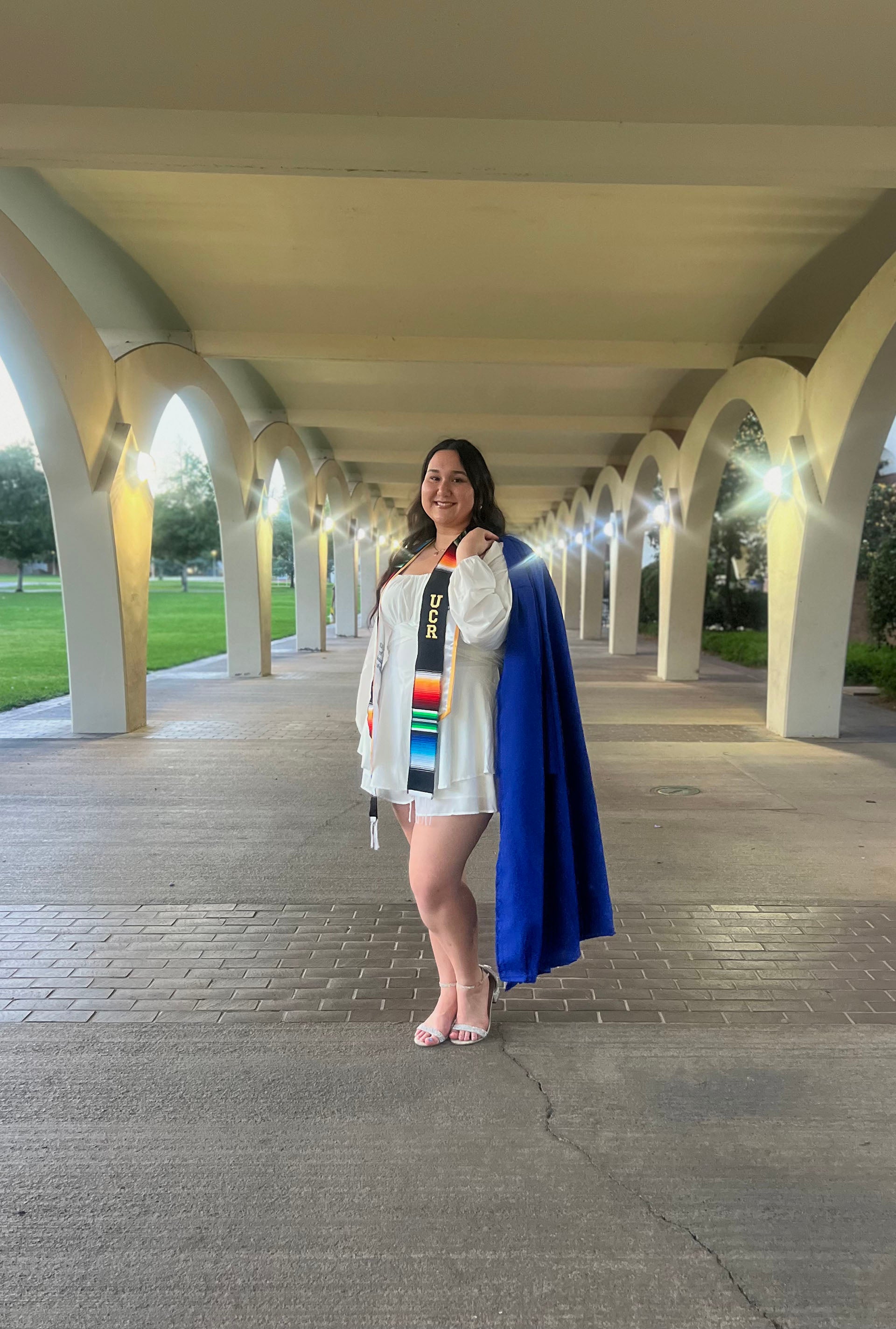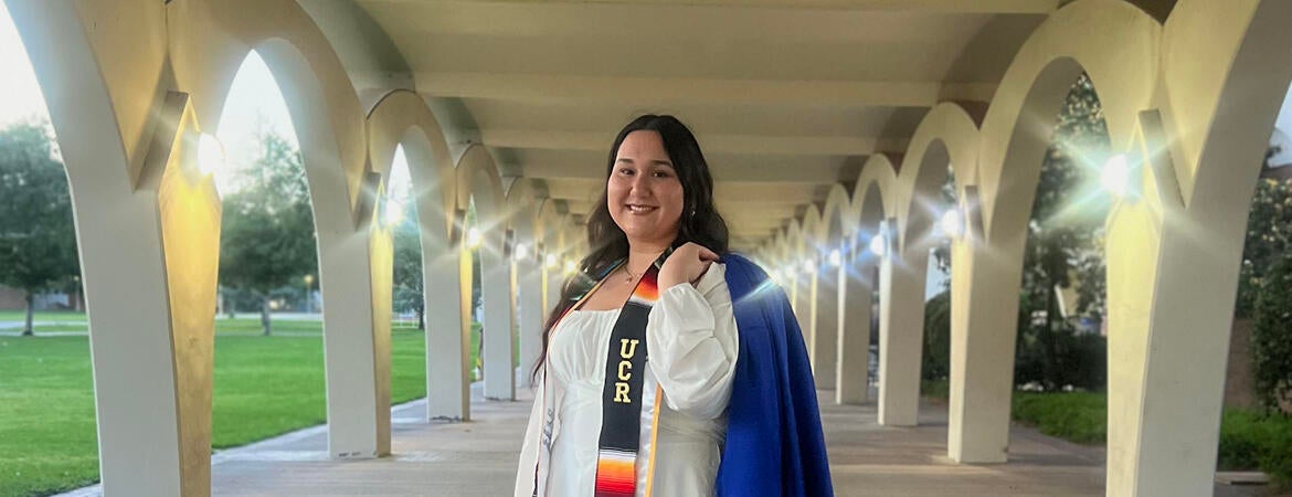 FEATURED PHOTO. Celeste Ponce stands underneath the arches of the Tomás Rivera Library, gown draped behind her.
