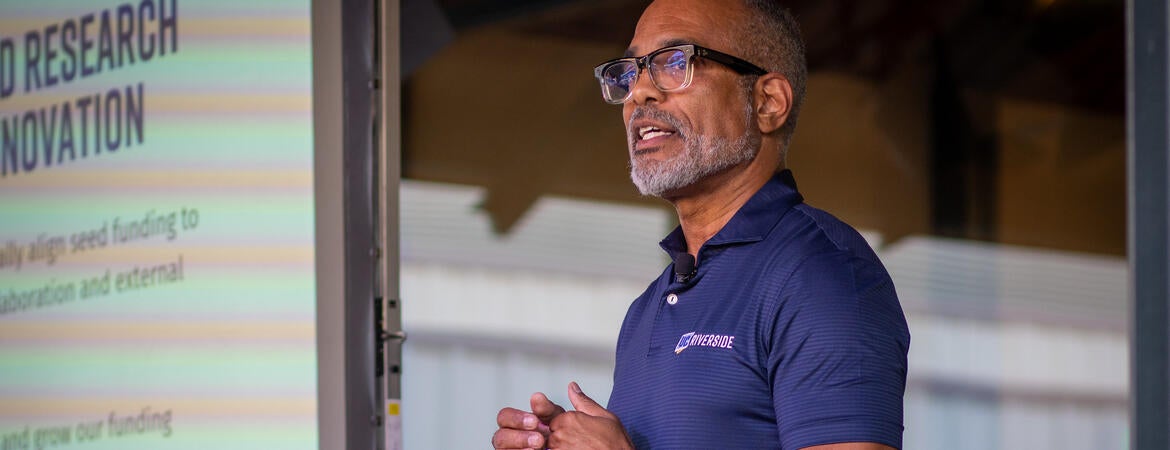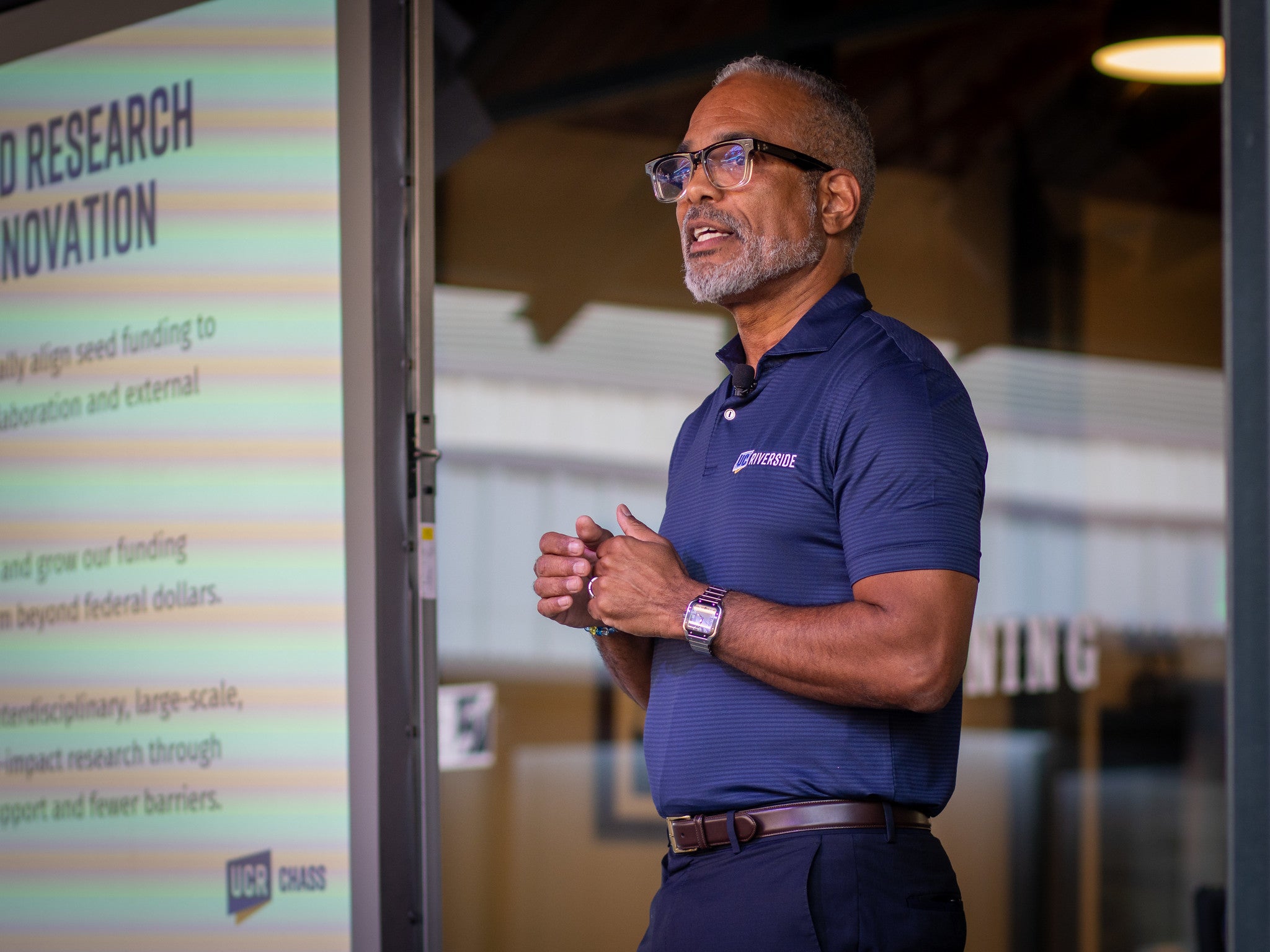 FEATURED PHOTO. CHASS Dean Daryle Williams announces plans for the Dean’s Research Impact Initiative during the 2025 CHASS State of the College, held at UC Riverside’s Barn restaurant on November 5, 2025. Photo by Lyndsey Rankin, CHASS Marketing and Communications.