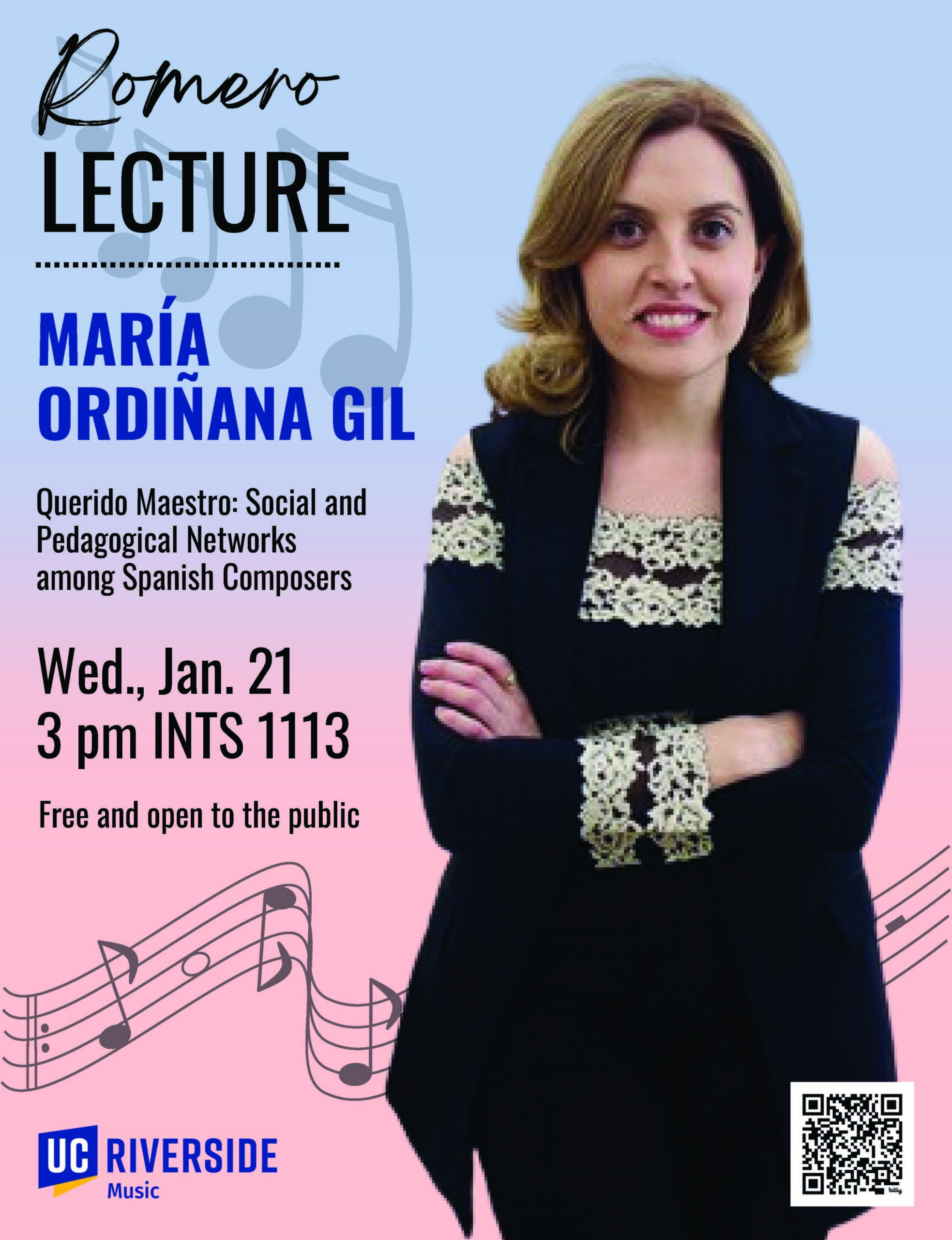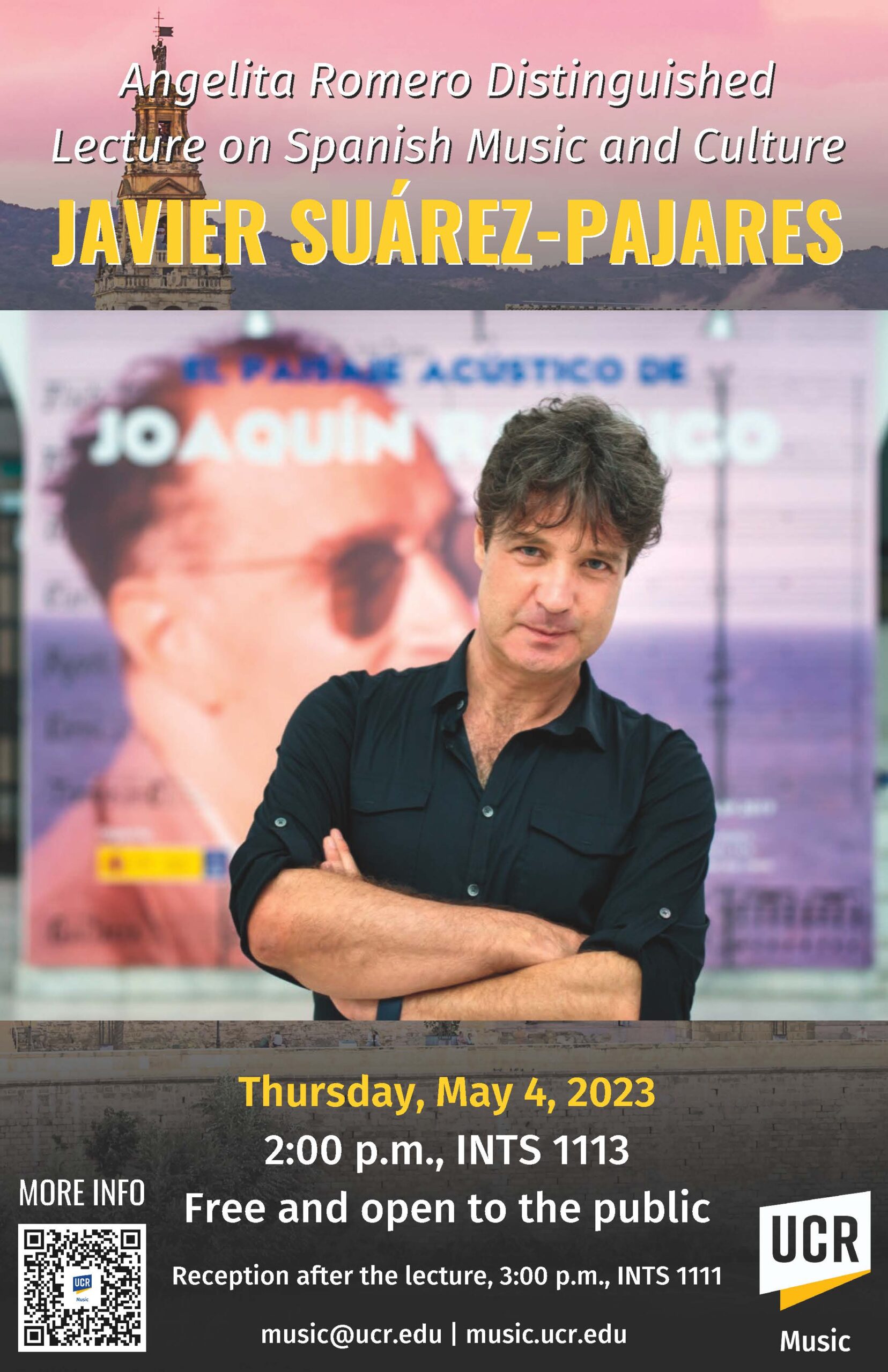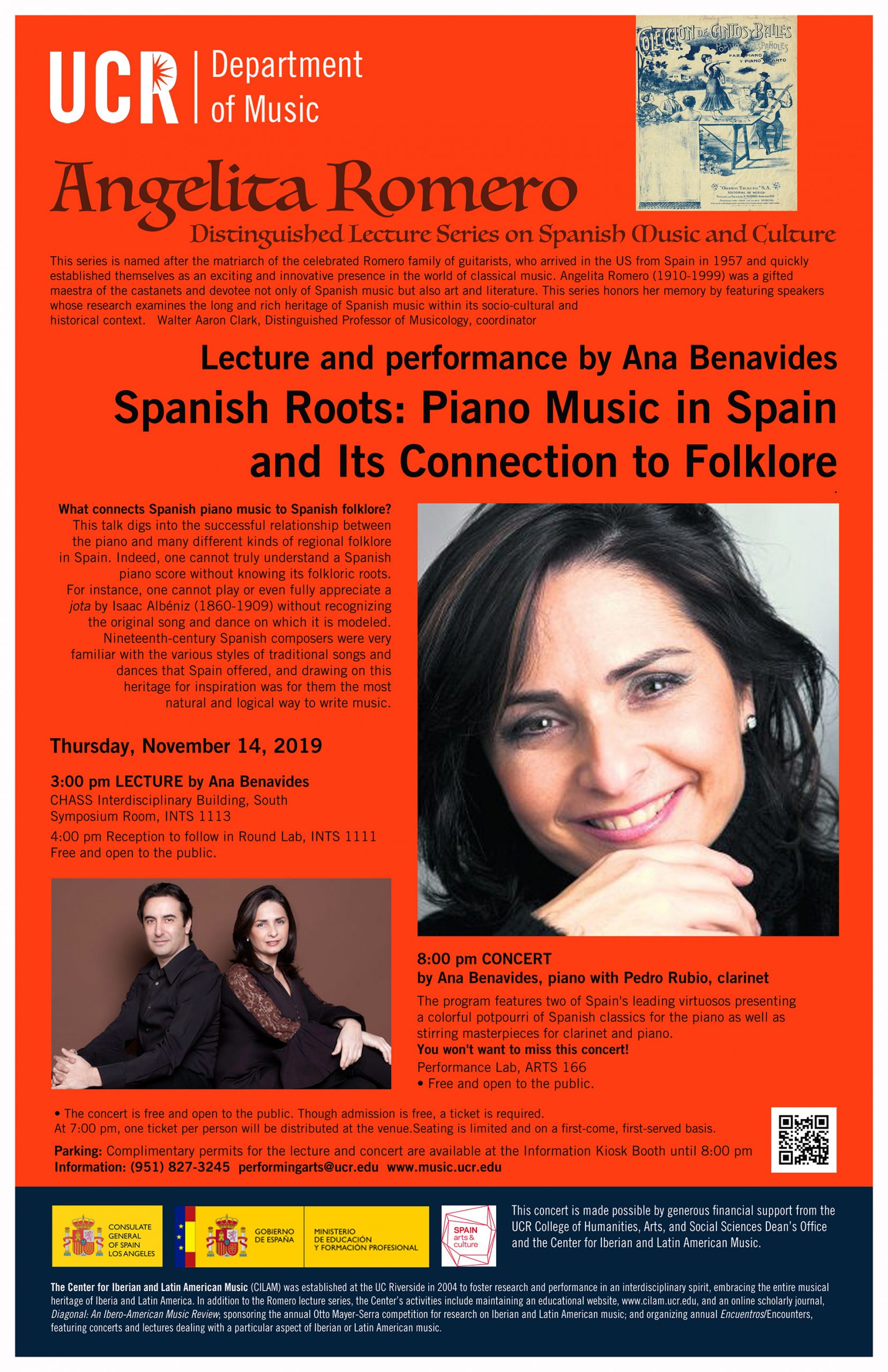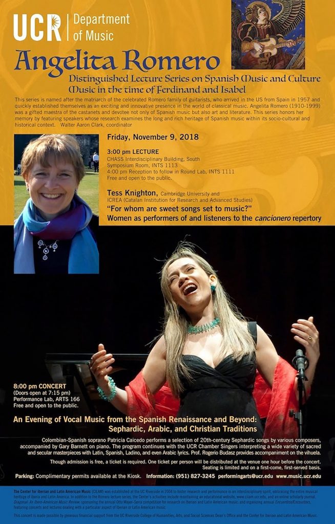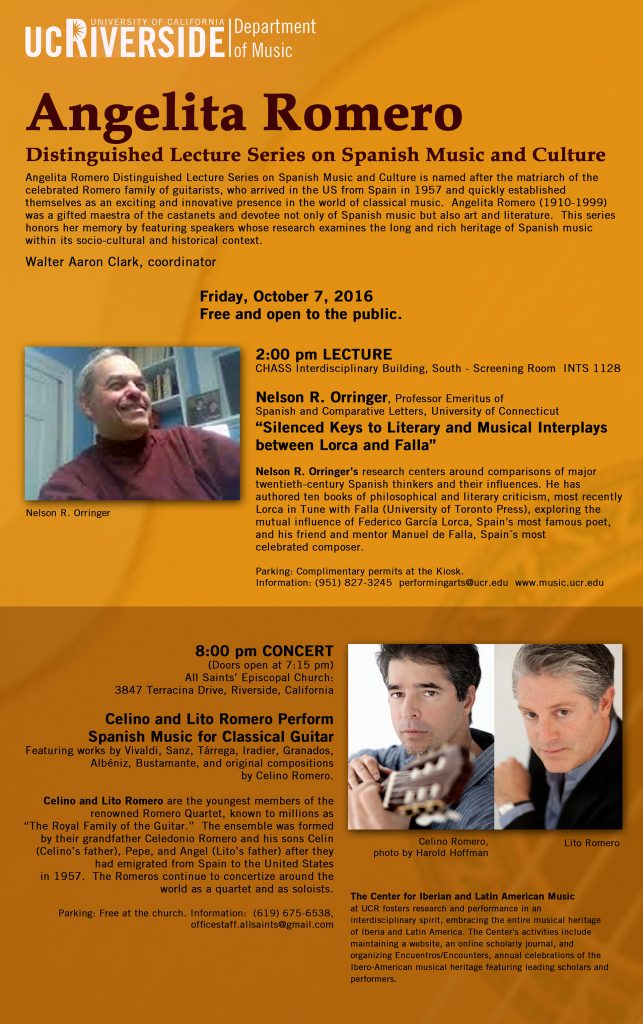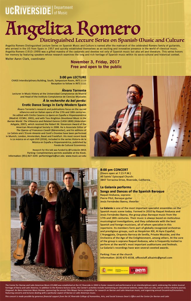 The Angelita Romero Distinguished Lecture Series is named after the matriarch of the celebrated Romero family of guitarists, who arrived in the United States from Spain in 1957 and quickly established themselves as an exciting and innovative presence in the world of classical music. Angelita Romero (1910-1999) was a gifted maestra of the castanets and devotee not only of Spanish music but also art and literature. Sponsored by the Center for Iberian and Latin American Music at UCR, this series honors her memory by featuring speakers whose research examines the long and rich heritage of Spanish music within its socio-cultural and historical context. The afternoon lectures are followed by a reception and then an evening concert of music relevant to the talk.