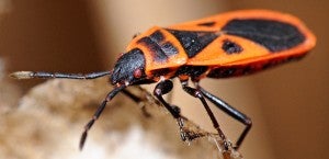 Description: Adults are typically 7 to 9 mm in length and display aposematic warning coloration of contrasting red and black. The head, antennae and legs are black. The forewings (hemelytra) which cover the back of the insect are conspicuously marked with two round black spots against a bright orange-red background color. The thoracic sternites are red-orange and the abdominal sternites are bright orange-red with various black markings laterally. Nymphs can be entirely red, with increasing dark maculation developing with each molt.