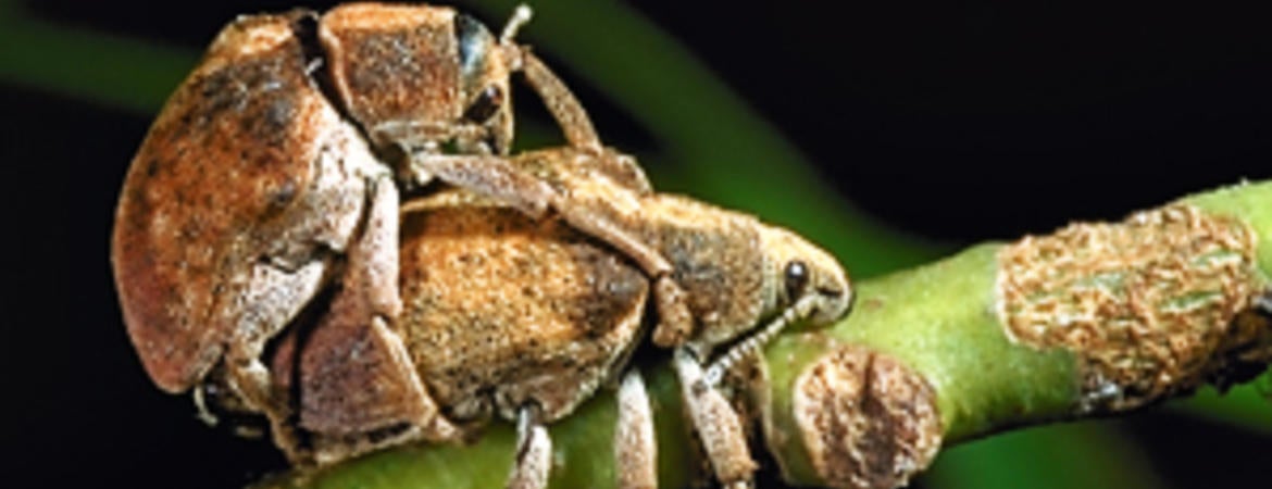 Damage and Economic Impact: Both larval and adult snout beetles consume eucalyptus foliage, particularly new shoots and leaves. Adult feeding damage is characterized by notching of the leaves, giving them a scalloped appearance. Young larvae score trenches in the leaf surfaces, while older larvae consume the entire leaf. Trees are rapidly defoliated by feeding weevils and can be killed by repeated defoliation. Snout beetle populations can build to high levels in a matter of months, so that entire windbreaks and groves can be quickly stripped of foliage and eventually killed. Area-wide control of the snout beetle with insecticides is not feasible because of the problems associated with pesticide coverage of large trees spread over significant areas. Pesticide use is especially problematic in residential areas.