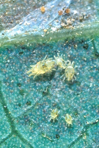 Damage: Persea mites feed in colonies beneath protective webbing (i.e., nests) along midribs and veins on the undersides of leaves, and feeding damage produces characteristic circular necrotic spots. High mite densities (500-2000 per leaf) and subsequent feeding that damages 7-10% of the leaf surface can cause partial or total defoliation of trees. Mite-induced defoliation opens the tree canopy, increasing the risk of sunburn to young fruit and exposed tree trunks. Premature fruit drop can occur. Defoliation by persea mites promotes new flushes of growth which disrupts carefully planned irrigation, fertilization, pruning and dust management programs. Mite-induced flushing may enhance avocado thrips populations, which prefer young leaves for feeding and oviposition. This mite builds to extremely high densities over summer before declining in fall. Population declines occur because of resource depletion occurring from excessive feeding damage to leaves. The current industry control practice is to apply foliar applications of insecticides. In some instances insecticide applications have caused resurgence of pest populations probably because of declines in numbers of common generalist predators. Resurgence results in persea mite population densities exceeding those found on non-sprayed trees.