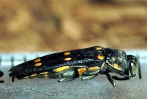 Adults are about 10 mm long and 2 mm wide. They are bullet-shaped and can be identified by the six golden-yellow spots on the dark green forewings. Mature larvae are about 18 mm long and 3 mm wide. They are legless, white, and have a long slender appearance. The larvae possess two pincher-like spines at the tip of the abdomen. Pupae are found in the outer bark and resemble adults, but are commonly white in color. Eggs are probably laid in bark crevices like other Agrilus spp., but have not been observed by the authors.