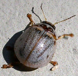 Identification: Both beetle species are similar in size, about the size of a ladybug. Eucalyptus leaf beetle adults are gray to reddish brown and the larvae are greenish-gray. The Australian tortoise beetle adult and larvae are both dark brown.