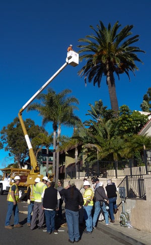 From the walking inspection that was conducted on Monday 29 November, one Canary Islands palm was identified on the Pacific Coast Highway as having a high probability of being infested with RPW. Don Hodel (an environmental horticulturist for the University of California Cooperative Extension, Los Angeles County with expertise in palms) arranged for a bucket truck with West Coast Arborists to be available for the morning of Wednesday 1 Dec 2010 so the suspect palm could be inspected. Josep Jacas (RPW expert from Spain) helped to remove damaged palm fronds from the palm of interest. He also examined the crown of the palm for RPW feeding damage, and for evidence of live RPW life stages (e.g., fresh cocoons or adults) on the trunk of the palm and in the foliage.