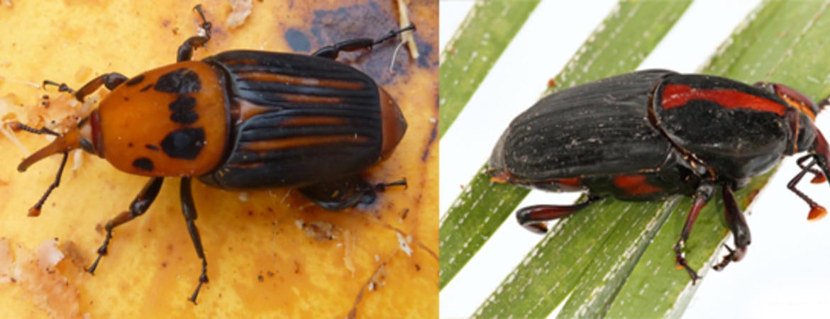 Treatment 2: Freshly felled coconut palms that were bucked, stacked, and had palm hearts arranged on the wood pile were inspected for RPW attracted to this resource. This treatment was replicated three times. The plantation owner was asked to fell five palms that were suspected to be infested with RPW. All five palms exhibited extensive internal damage, but no RPW life stages were found and it is was difficult to determine if feeding damage had been caused by RPW or another serious coconut pest, Oryctes rhinoceros beetles.