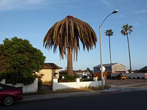 A plan was made to drop a weevil infested Canary Island date palm tree in a residential area in San Diego County and from this palm weevil life stages would be collected and filmed. The first challenge was finding an infested palm, which we did, and the bigger challenge was to bring the palm down and then cut it up so we could examine the crown of the dying palm for weevils.