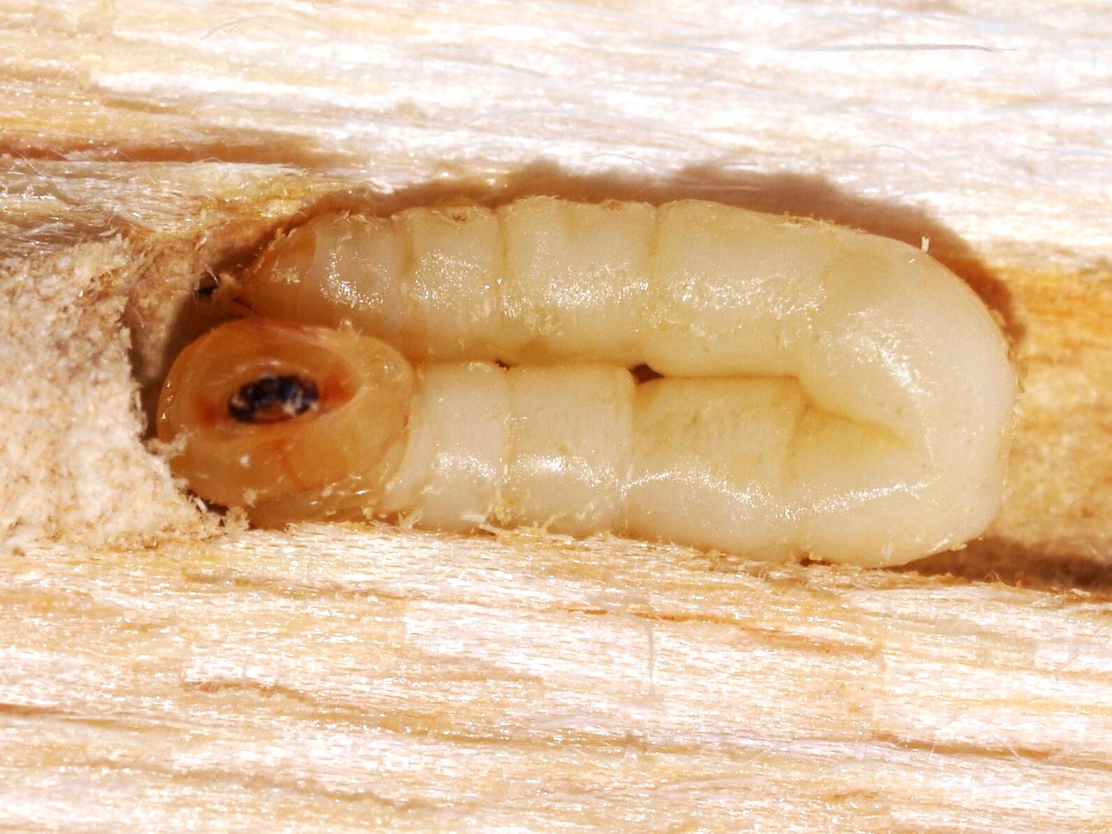 Description: EAB adults are relatively small beetles, approximately ½” in length, with bright metallic-green wings. Females lay dozens of eggs in or under the bark on trunks or branches. After eggs hatch, the larvae tunnel into the tree to access vascular tissues. Larvae are light colored, approximately 1.5” in length, and have distinctive bell-shaped segments compared to more rectangular-shaped segments in related beetle species. EAB remains within the tree through pupation, after which adults exit leaving behind characteristic D-shaped emergence holes. Based on observations from the eastern US, adults begin to emerge in the Spring and can be active through late summer, with peak activity occurring in early Summer