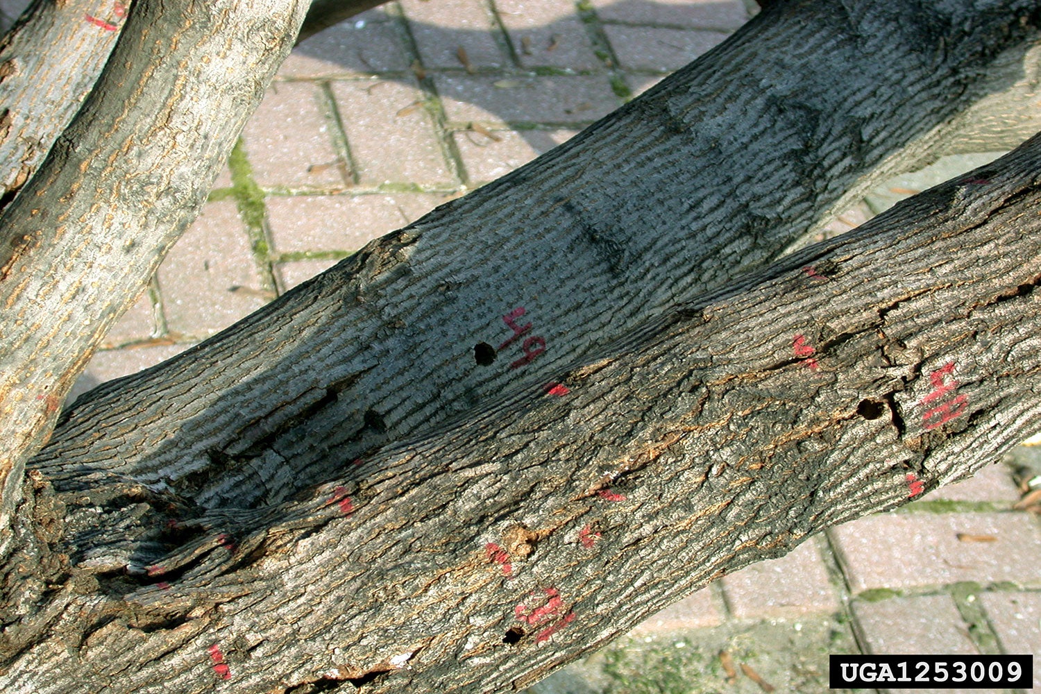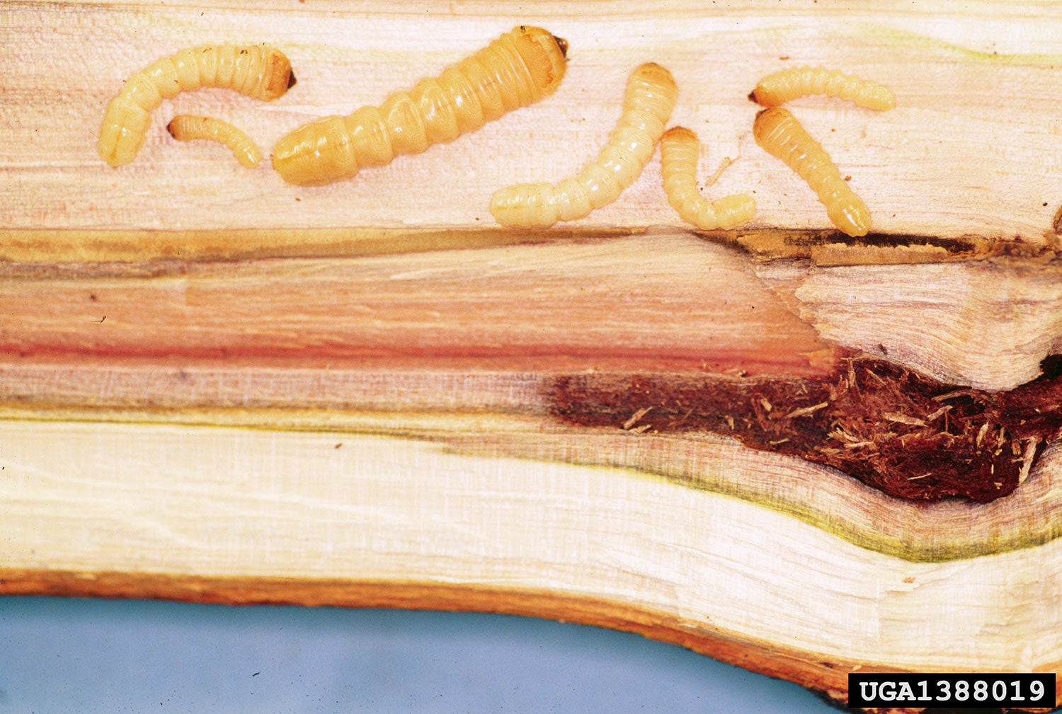 Damage: Oviposition cavities chewed out by females are found in tree trunk bark and branch junctions, or on the trunk itself. As larvae mature, they enter the heartwood of the tree, destroying the quality of the wood, while feeding by large numbers of beetle larvae can kill trees by girdling them. Adult beetles emerge in the summer through 3/8" diameter holes in the bark. Sap flows heavily from these large wounds and infested trees are prone to secondary attack by other diseases and insects. This beetle adversely affects the human environment by killing valuable shade and park trees, as well as injuring or even killing forest trees of economic value (e.g., sugar maples in the northeast USA). Structural weakening of trees by tunneling larvae also poses a physical danger to pedestrians and vehicles from falling limbs or trees during wind and/or ice storms.