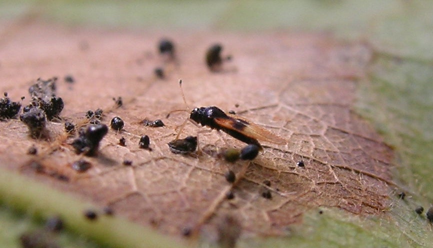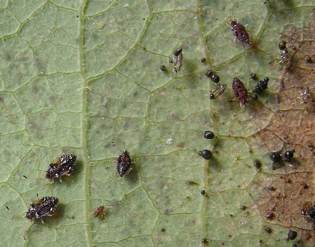 Damage: Lace bugs restrict their feeding to the undersides of leaves, inserting their needle-like mouthparts into leaf tissue cells to extract cell contents. Feeding initially causes small white or yellow spots on the surface of the leaves as individual cells dry out. It is suspected that feeding damage can provide entrance for pathogenic fungi, in particular Colletotrichum spp., which are leaf anthracnose fungi. As lace bug colonies grow, brown necrotic (dead) areas develop where there has been heavy feeding damage. These necrotic areas look like tip-burn caused by salt damage, but in this case, the necrotic areas are islands of dead tissue in the interior of the leaf surrounded by living tissue. Heavy feeding can cause striking leaf discoloration and early leaf drop.