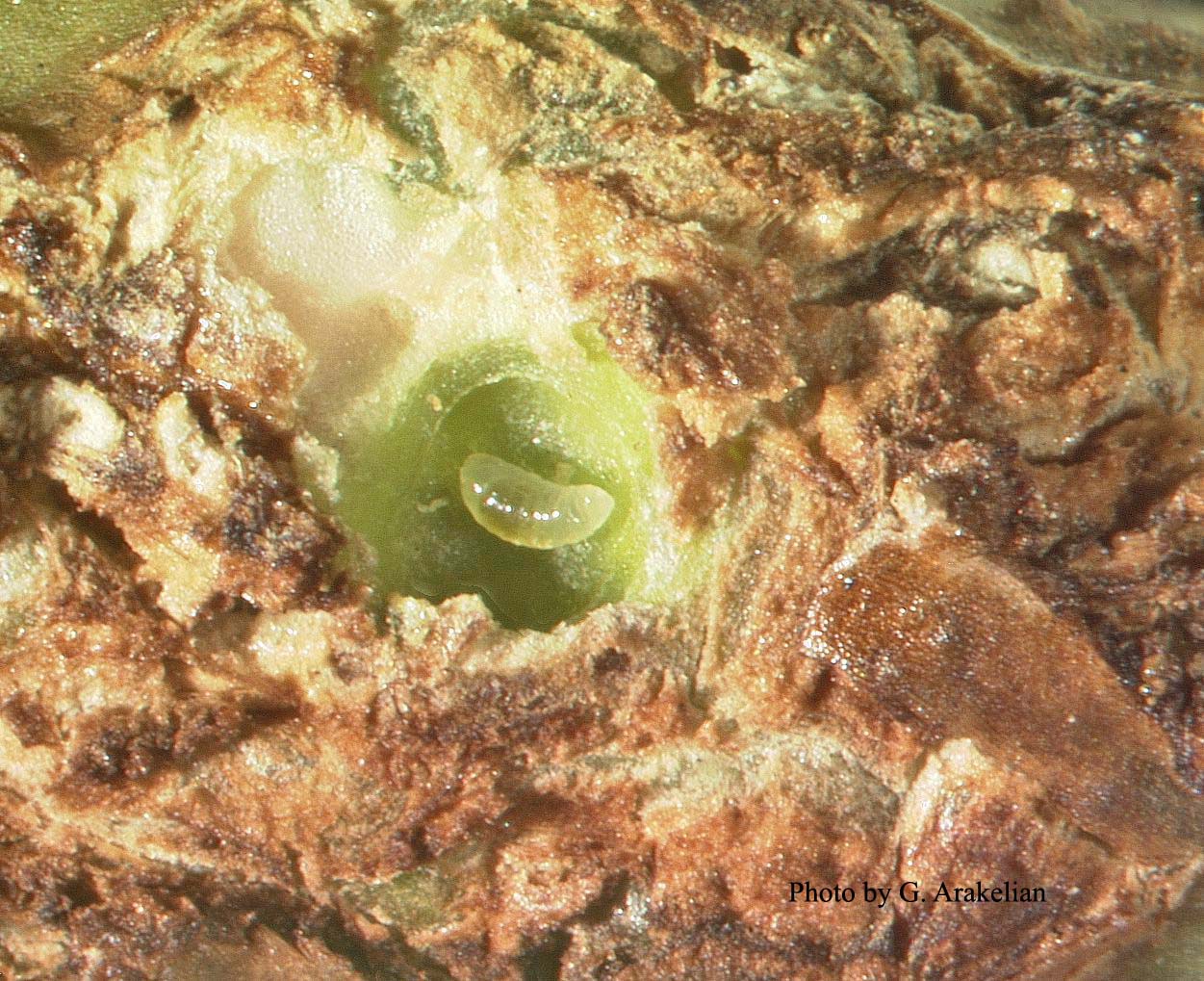Examination of these galls by County Entomologists revealed the presence of small internally feeding larvae which were responsible for the observed damage. Larvae were being reared to adulthood to confirm the association of adult galling wasps with observed galls. The life cycle of this pest may take up to five months to complete. Initial identifications tentatively placed with this wasp in the genus Ophelimus,but this identification was changed by specialists who work on this group of insects who recognized it as a species new to science. It is likely that in the absence of host specific natural enemies Blue Gum Galling Wasp will spread quickly throughout California and may cause considerable damage to vulnerable eucalyptus species. It is possible that this pest may invade other countries, such as Bolivia, China, Colombia, Ethiopia, India, Peru and Spain which grow blue gums commercially for fuelwood, pulpwood, and eucalyptus oil.