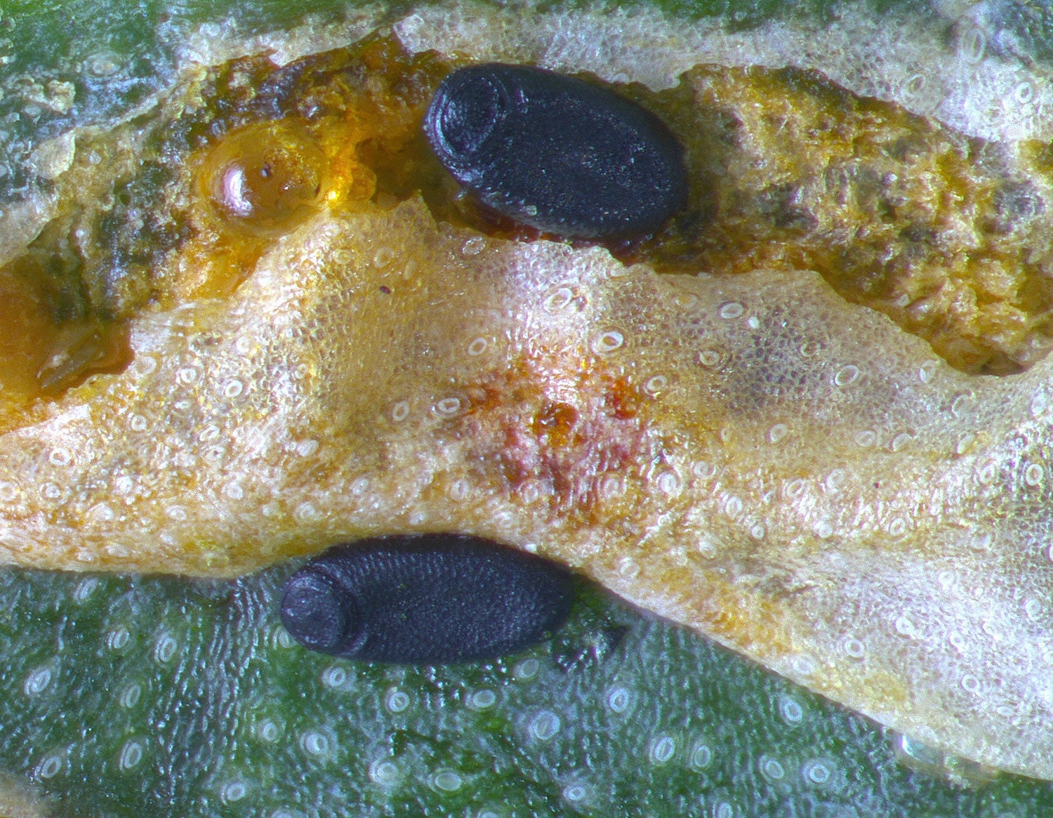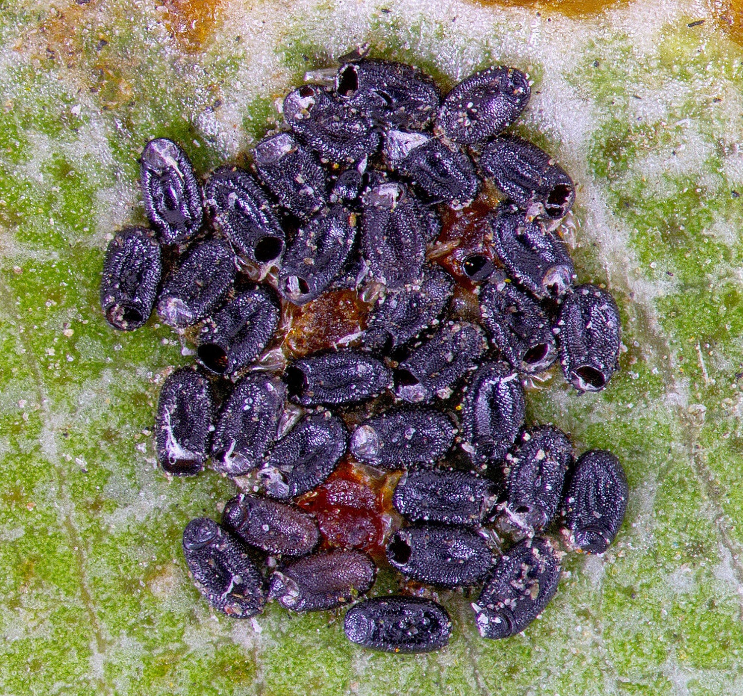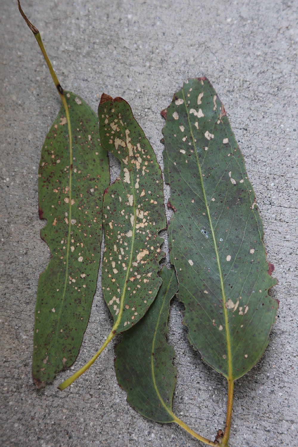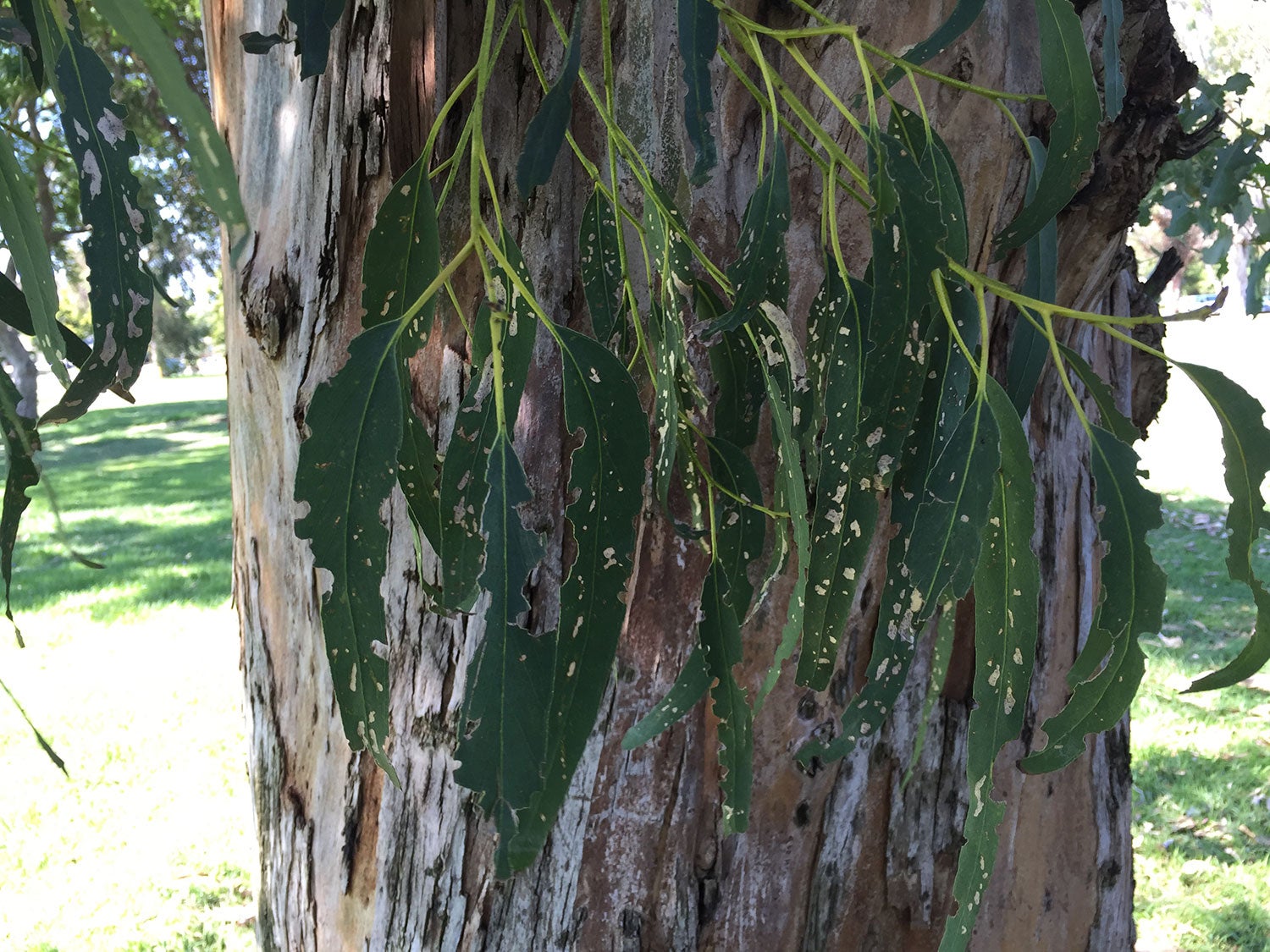 Hosts and damage: Attacks more than thirty species and hybrids of Eucalyptus and Corymbia, including the following widely planted in California trees: E. camaldulensis (Red Gum), E. globulus (Blue Gum), C. citriodora (Lemon-scented Gum) and C. maculata(Spotted Gum).