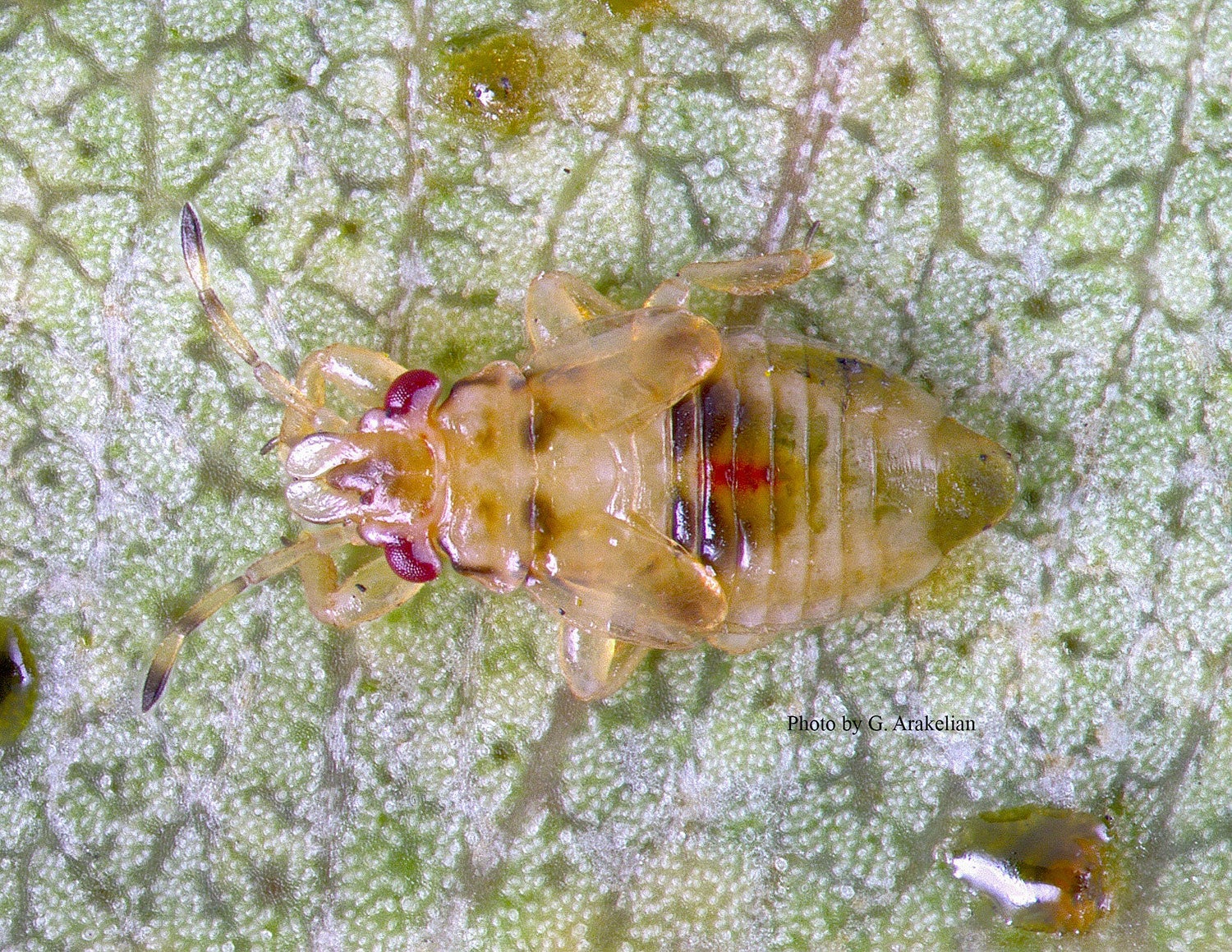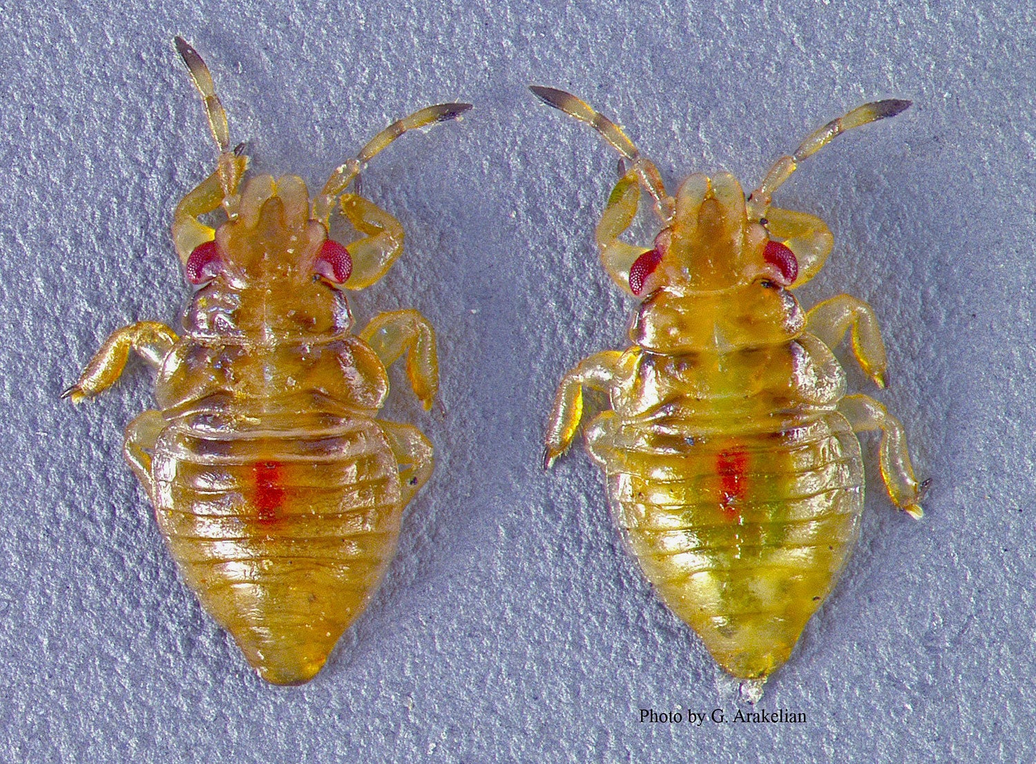Nymphs have tan to orange colored bodies with brown spots on their thoraxes and some abdominal segments. Eyes and the areas around dorsal abdominal scent glands are red. Eggs (about 0.5 mm long) are black, oval and flattened. They are usually deposited singularly or in clusters on the leaves and some smaller branches.