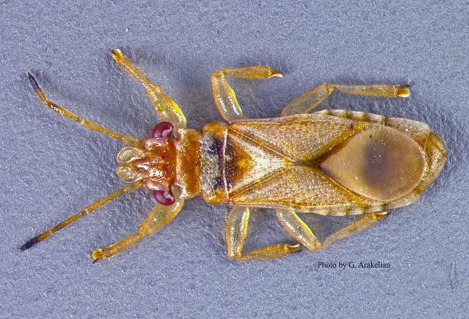 Field Identification: Adults (2.0-3.0 mm long) have orange/light brown flattened bodies with some dark brown areas. Eyes are red, bulging and pedicellate. Mandibular plates are strongly produced anteriorly. Tibiae with a unique lobate appendix (a structure enhancing their grasping ability to the substrate). Antennae are light brown with black tips.