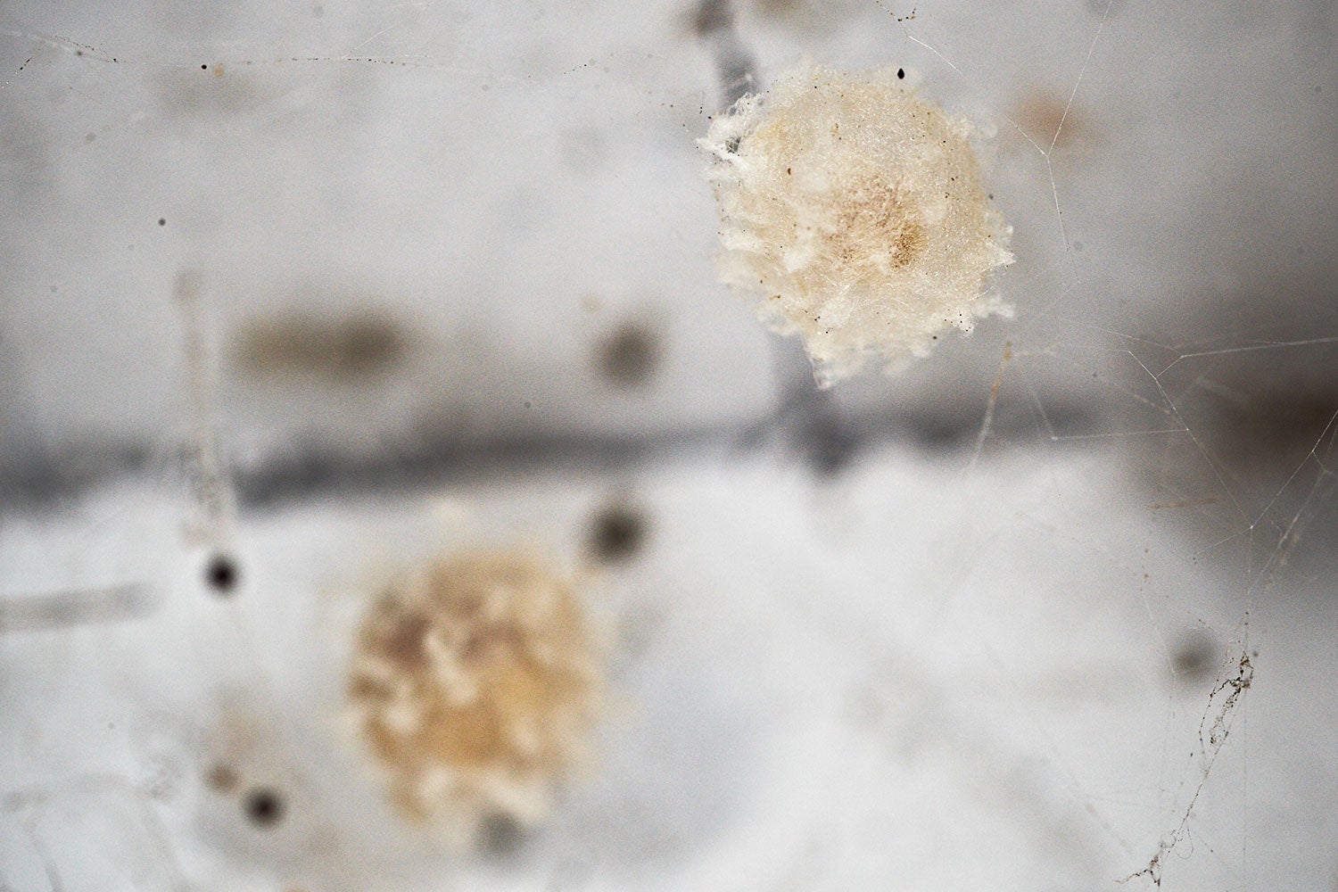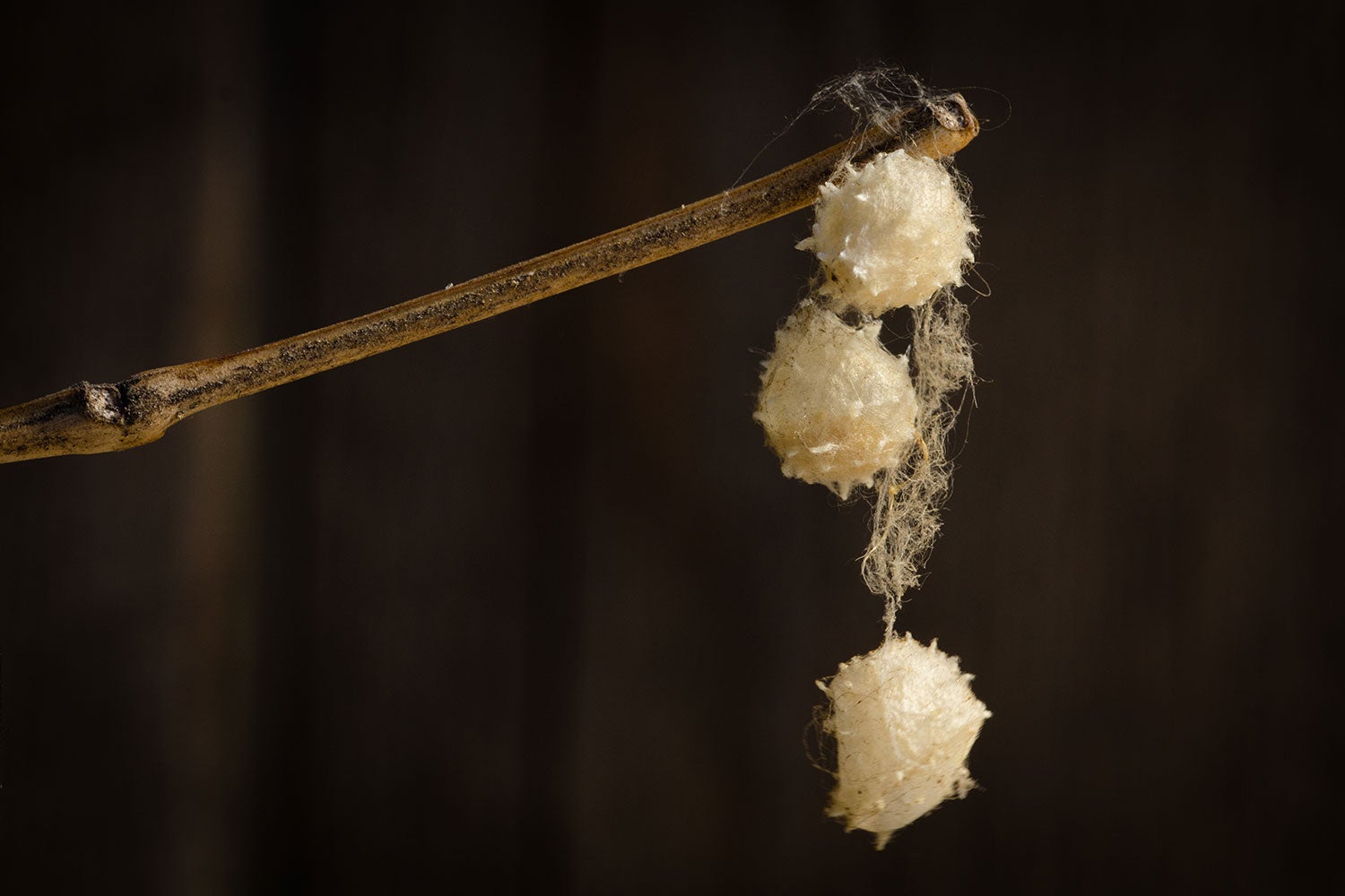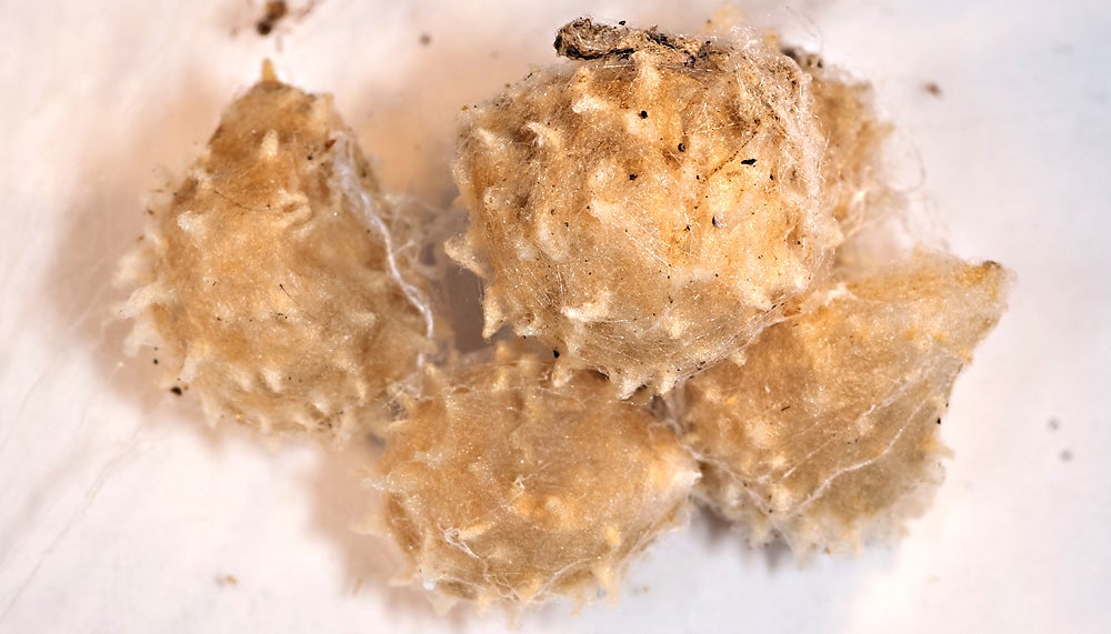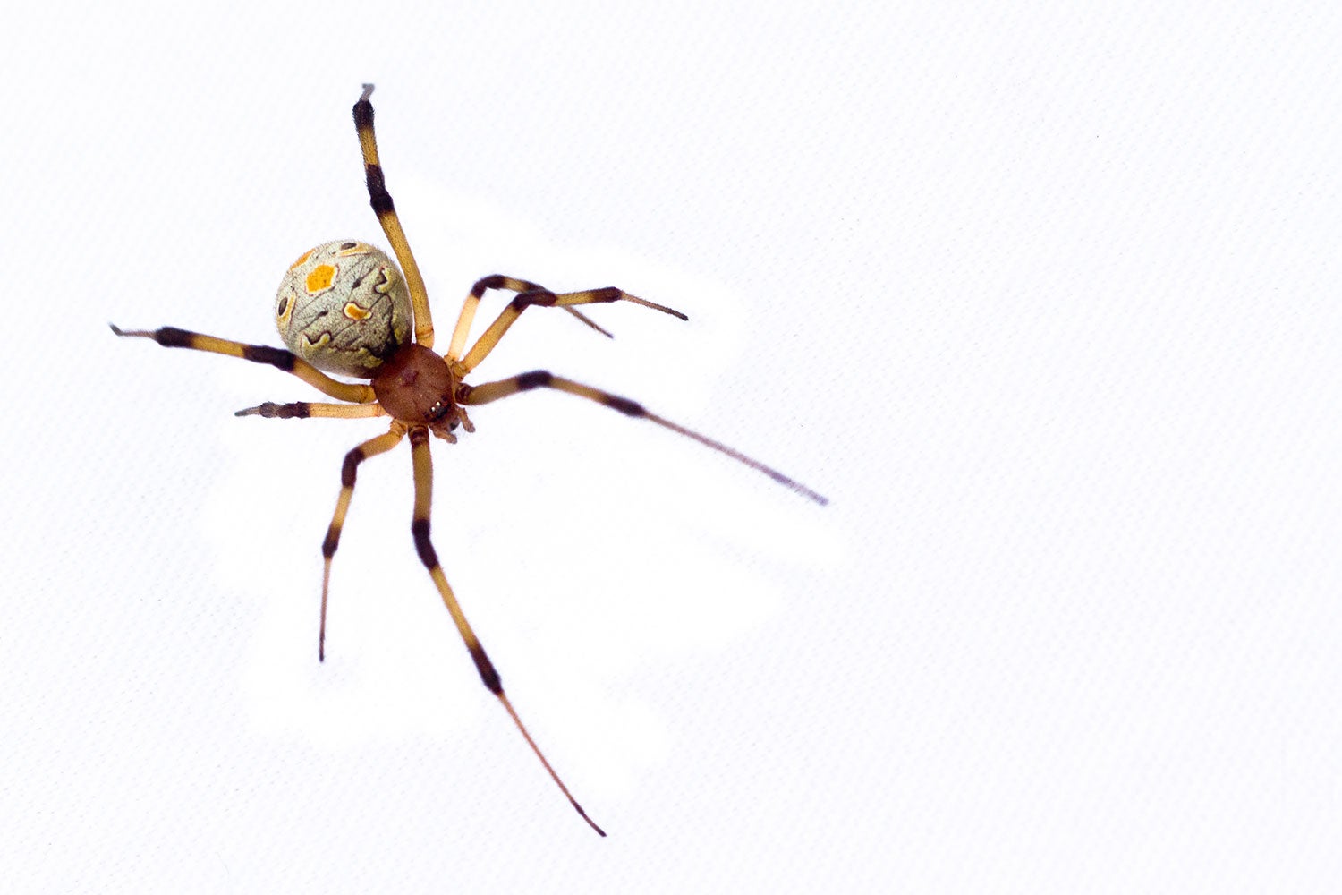 Description of the Brown Widow: Unlike its starkly black-and-red colored relative, the black widow, the coloration of a brown widow consists of a mottling of tan and brown with black accent marking. In mature females, there is usually a dorsal longitudinal abdominal stripe and three diagonal stripes on each flank. At the top of each diagonal stripe, there is a black mark, which is rather conspicuous and square-ish. The Brown Widow Spider does have an hourglass but it is typically an orange shade rather than the vivid red of a black widow. The brown widow looks similar to immatures of the western black widow spider, the latter of which has smaller black spots on the top of the diagonal abdominal stripes and more olive grey background coloration. Being able to discern brown widows from immature black widows is therefore difficult and requires some experience. However, a more diagnostic feature of a brown widow is its egg sac. Most spider egg sacs that are free (i.e., are not attached to flat surfaces) look like a lemon drop candy or a little cotton ball with indistinct edges. The egg sac of a brown widow has multiple silk spicules projecting out from the surface. The egg sac has been described as looking like a large pollen grain or a World War II harbor mine designed to blow up ships. The egg sac of the Brown Widow Spider is so distinctive that it is readily recognizable.