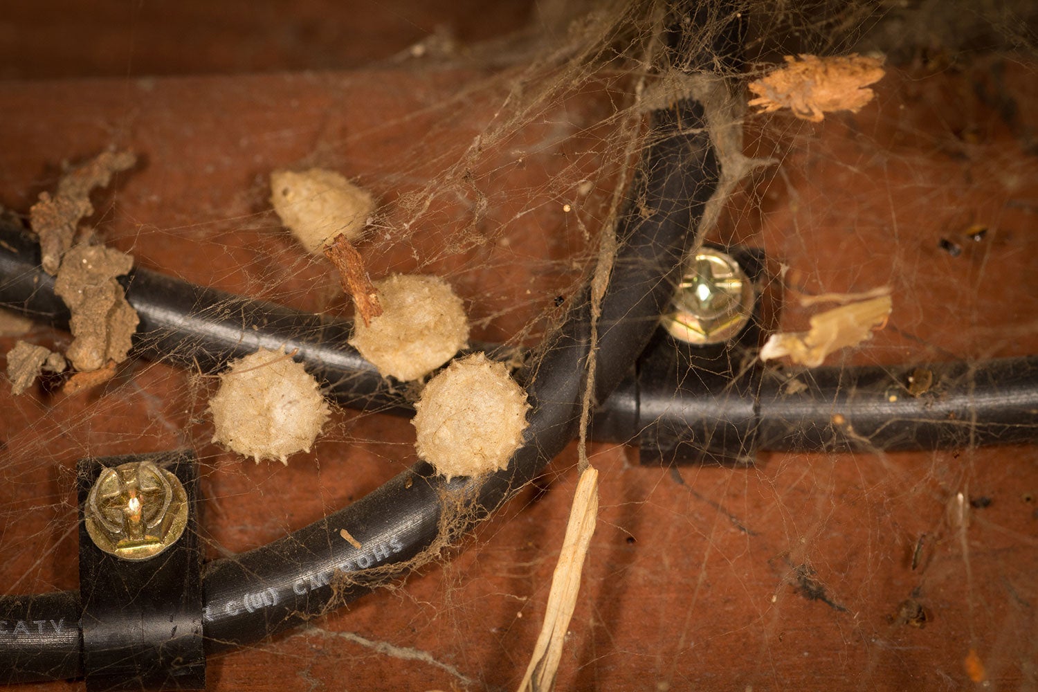 Habitat Preferences: The brown widow builds its web in secluded, protected sites around homes and in woody vegetation with branches. Some typical sites selected by brown widows for web building are empty containers such as buckets and nursery pots, mail boxes, entry way corners, under eaves, storage closets and garages, recessed hand grips of plastic garbage cans, undercarriages of motor vehicles that are stationary for long periods, and the undersides of outdoor furniture and wrought iron railings. They choose places that are more exposed than sites chosen by black widows and hence, appear to be at higher risk for interactions with humans as for as bites are concerned.