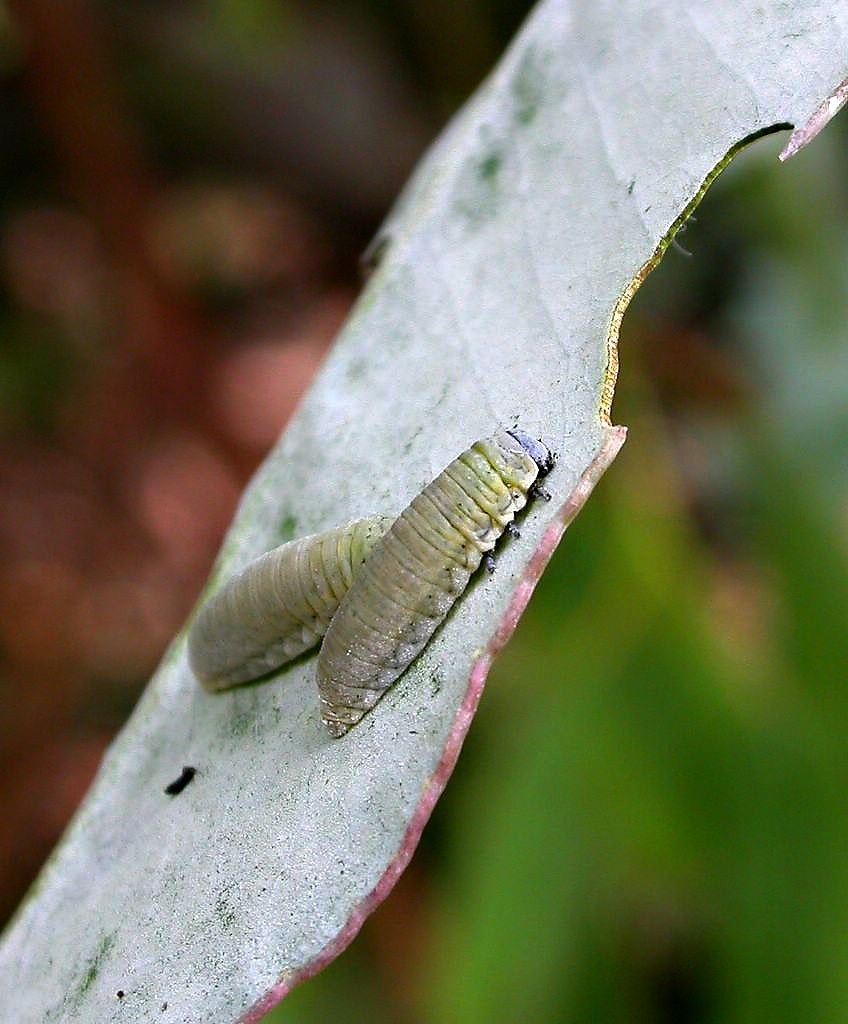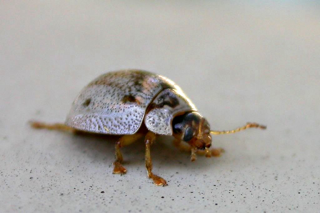 Identification: Both beetle species, C. m-fuscum and T. sloanei, are similar in size, about the size of a big ladybug. Eucalyptus leaf beetle adults are gray to reddish brown and the larvae are greenish-gray. The Australian tortoise beetle adult and larvae are both dark brown.