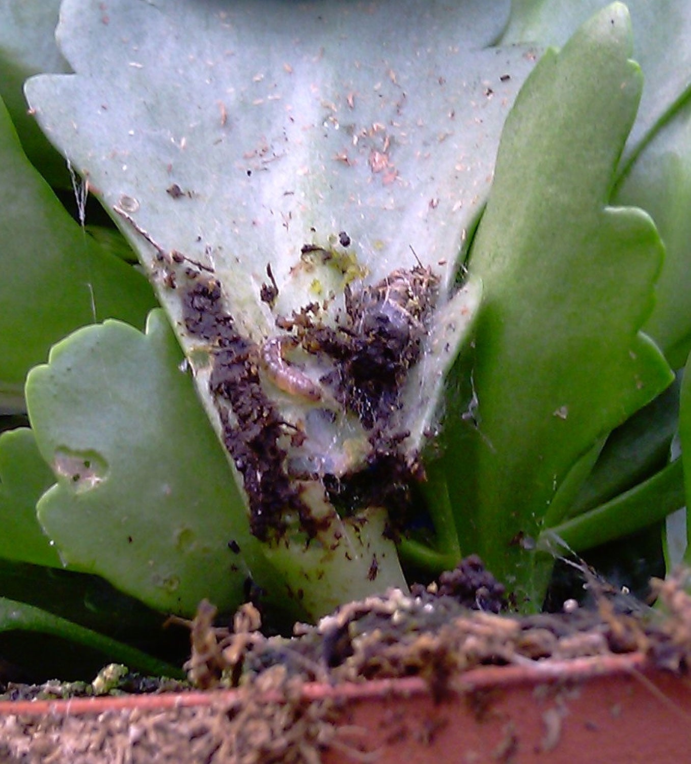 Damage: European Pepper moth larvae can damage roots, leaves, flowers, buds and fruit. In some crops, such as roses, they will feed primarily on crop debris such as fallen leaves. In other crops, chewing damage may be seen on the undersides of leaves, resulting in leaf necrosis (dead spots), and on stems where it sometimes results in stem girdling. In southern California, damage has been observed on gerbera, echinacea, kalanchoe, begonia and poinsettia.