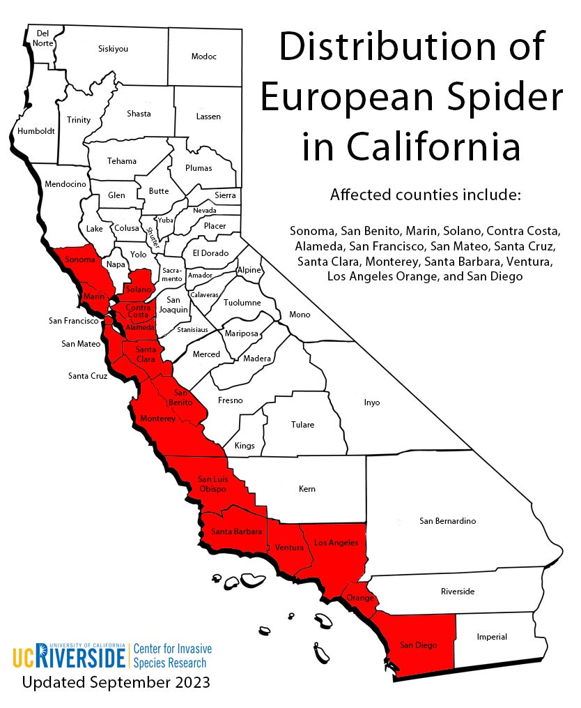 Distribution: European Spider is known from England, Spain and other portions of western Europe. In California, it was collected in Monterey, San Diego, Alameda and Ventura counties. It can be very common where it is found. Speculation is that it might have been introduced into California via the U.S. Naval base in Port Hueneme.